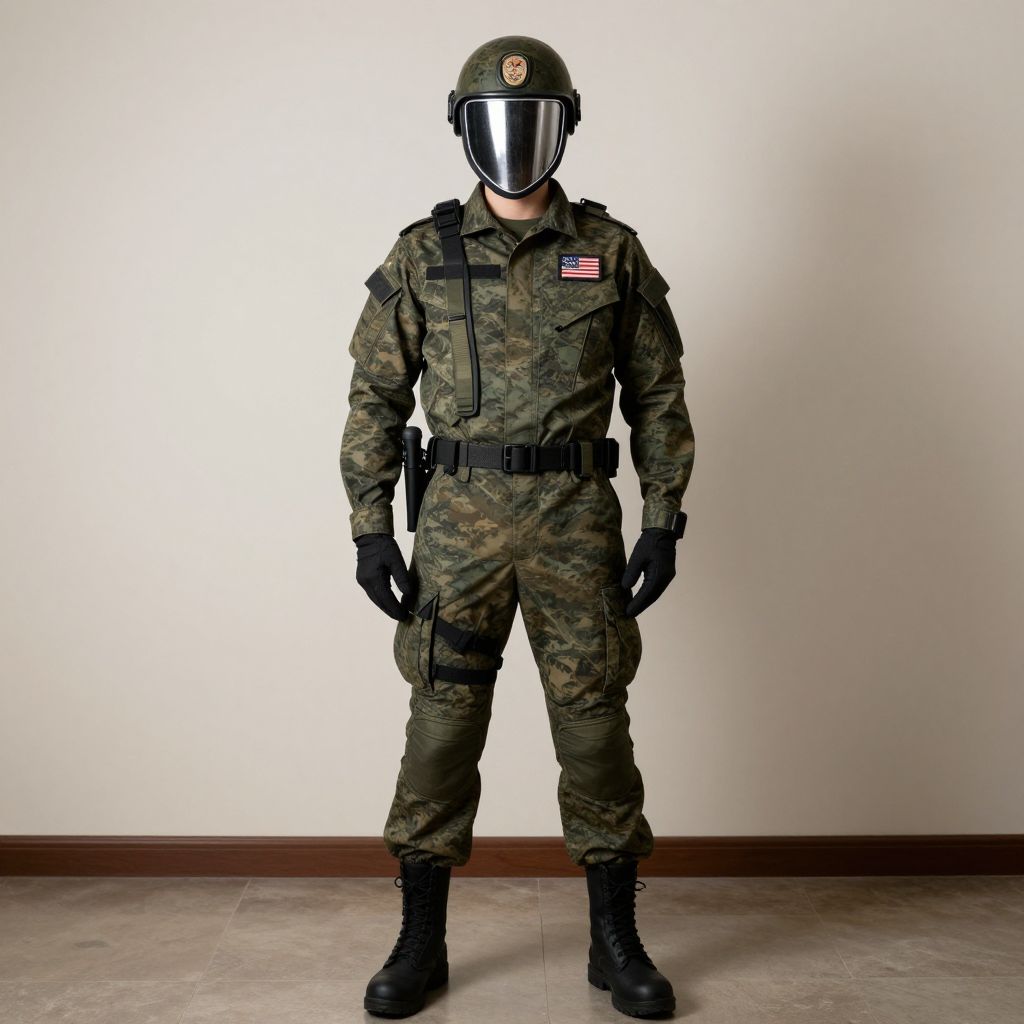 Photograph of a male soldier standing against a plain white wall with a wooden baseboard. He wears a green camouflage uniform with black tactical gear, including gloves, a utility belt with pouches, and black boots. An American flag patch is on his left chest. He has a reflective helmet with a visor, obscuring his face. His stance is upright, with hands relaxed at his sides. The floor is concrete, and the lighting is even, highlighting the textures of his uniform and gear. The overall style is realistic and professional.