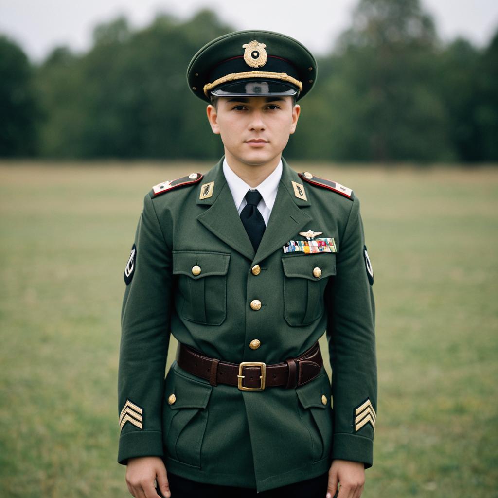Young boy wearing a detailed child's army officer costume including a green military jacket with gold buttons, rank patches on sleeves, medals, and badges on the chest, a peaked cap with an ornamental badge, white collared shirt, black tie, brown belt with buckle, and black pants. The boy stands outdoors with a blurred natural background, looking directly at the camera with arms at his sides.