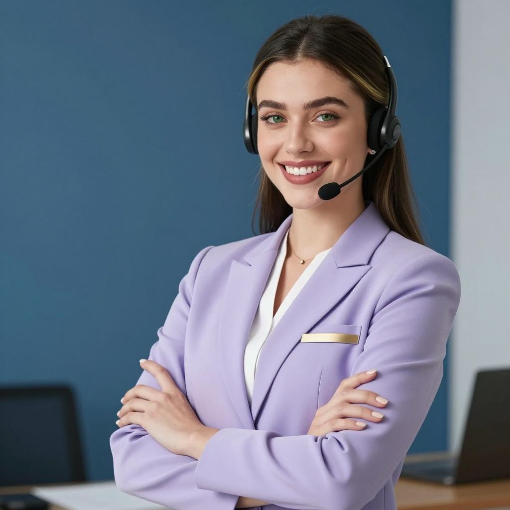 Portrait of a 23-year-old Brazilian woman with tanned skin and green eyes, wearing a lilac blazer and white blouse. She has long dark hair with blonde strands and is smiling confidently with arms crossed. The professional customer service representative wears a headset and poses in a modern office setting with a blue wall background.