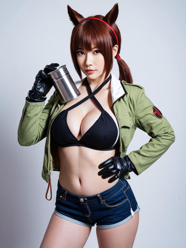 Photo-realistic cosplay photo of person in amane suzuha costume. 1girl, yellow eyes, green eyes, brown hair, long hair, twin braids, medium breasts, bike shortslifestyle stock photo, shallow depth of field, lifestyle stock photography, shallow depth of field, natural lighting, warm tones, soft background blur, candid moments, vibrant colors, realistic textures, modern casual clothing. full body shot