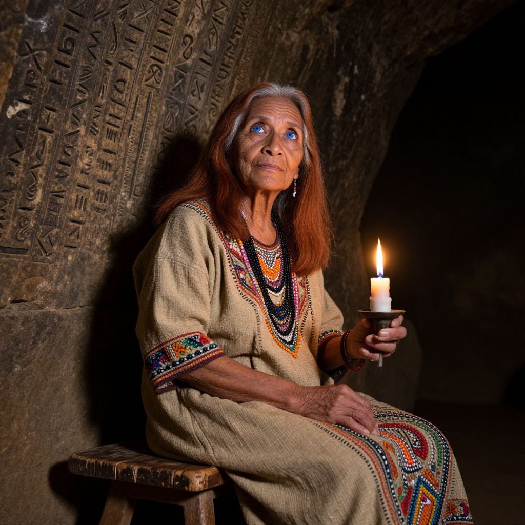 Imagine a photorealistic portrait of an elderly Pacific Islander woman with striking blue eyes and silver-streaked auburn hair. Captured by an iPhone camera, she sits serenely on a weathered wooden stool in the soft glow of candlelight within an ancient stone cavern. Her expression, one of curiosity and wisdom, is reflected in her gaze as she contemplates intricate runes etched upon the wall behind her. From a low-angle perspective, we focus on the intricate details of her warm, textured clothing adorned with beads and embroidery. Subtle shadows cast by the flickering light enhance the wisdom etched onto her face, creating an immersive atmosphere that seamlessly blends historical portraiture with evocative elements. This captivating scene invites viewers to explore the depths of human experience through the timeless gaze of a guardian of ancient knowledge.