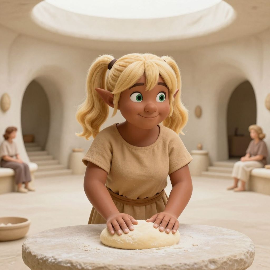 This digital CGI image depicts a cute, young female elf with blonde pigtails and large green eyes, standing in a softly lit, white-walled room with arched doorways. She wears a beige, short-sleeved tunic and a matching skirt. She is smiling and leaning forward with her hands on a white, circular table, kneading a lump of dough. In the background, two other similarly dressed characters sit on benches. The room has a warm, circular overhead light, and there are bowls and utensils on the table and floor, suggesting a kitchen or cooking area. The overall style is whimsical and cartoonish.