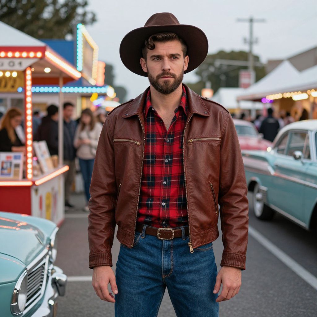 A bold ensemble at a retro themed festival: a man with a clean-cut beard and medium face structure, wearing a leather jacket and denim pants, his hair styled in the American wave hairstyle with subtle side parts, dressed in a 1950s-inspired costume with red plaid shirt and a wide brimmed hat, standing among neon-lit booths and vintage cars in a city roadside fair