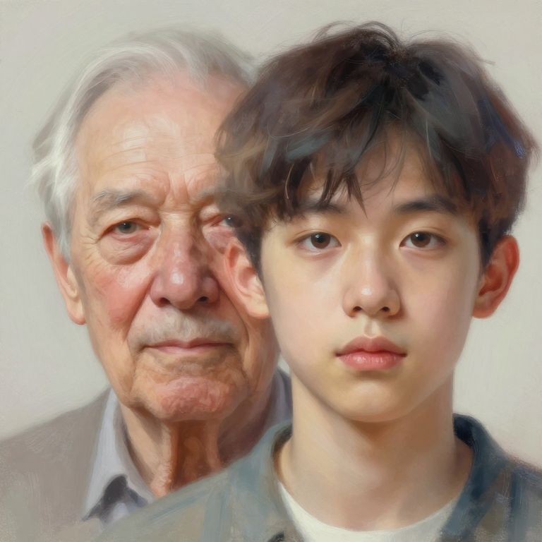 This digitally enhanced photograph depicts an elderly Asian man with white hair and a gentle expression, standing closely behind a young Asian boy with short, dark brown hair and a neutral face. The elderly man's weathered skin and wrinkles contrast with the boy's smooth complexion. They both wear simple, light-colored clothing; the man in a gray shirt and the boy in a white shirt. The background is a soft, out-of-focus white, emphasizing their faces. The image has a slightly painterly, digital art style, with subtle color enhancements and soft shading.