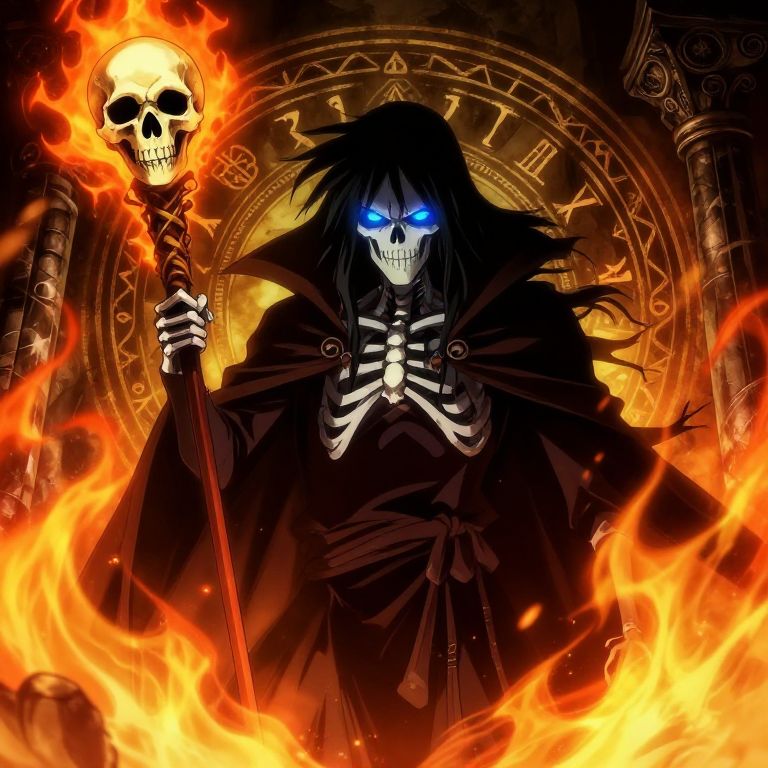 Anime lich in a haunted crypt, skeletal face with glowing blue eyes, wielding a staff topped with a skull, surrounded by ghostly flames and ancient magical symbols, dramatic lighting enhancing the mysterious atmosphere, intricate details and vibrant colors.