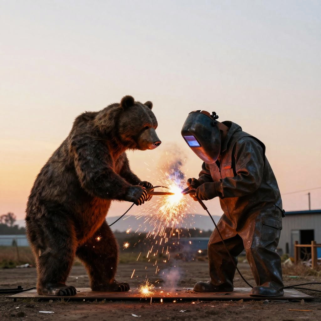 Photograph of a person in protective gear welding sparks between two bear silhouettes against a sunset-lit, industrial background.