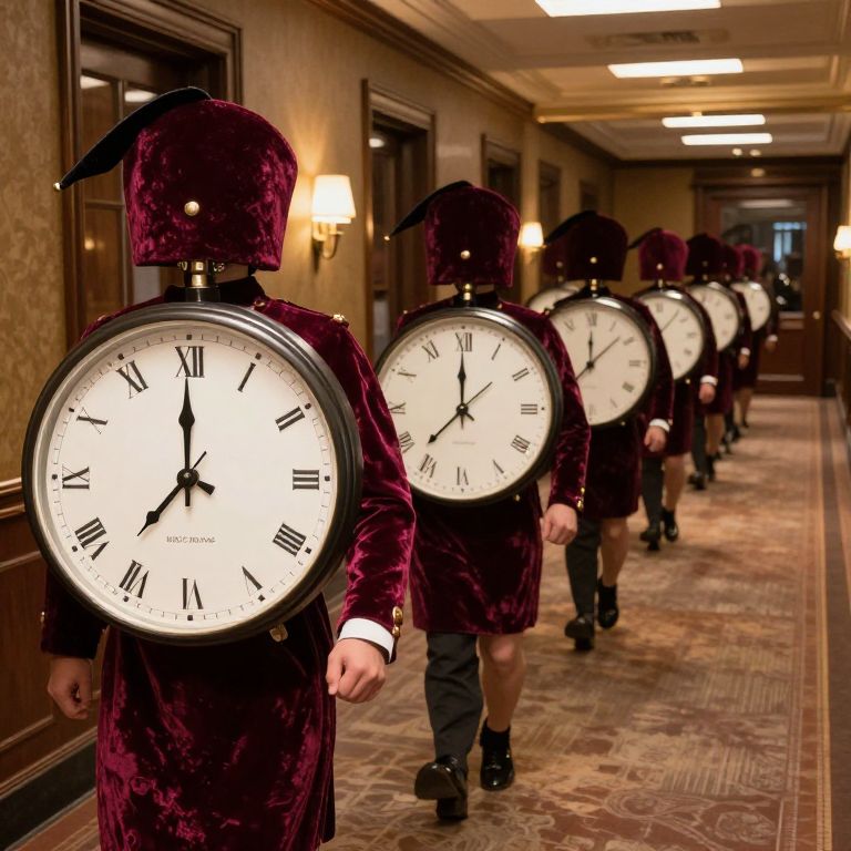 An army of velvet clocks marches down the hallway, each ticking at a paradoxical rhythm—backward, forward, and sideways at once.