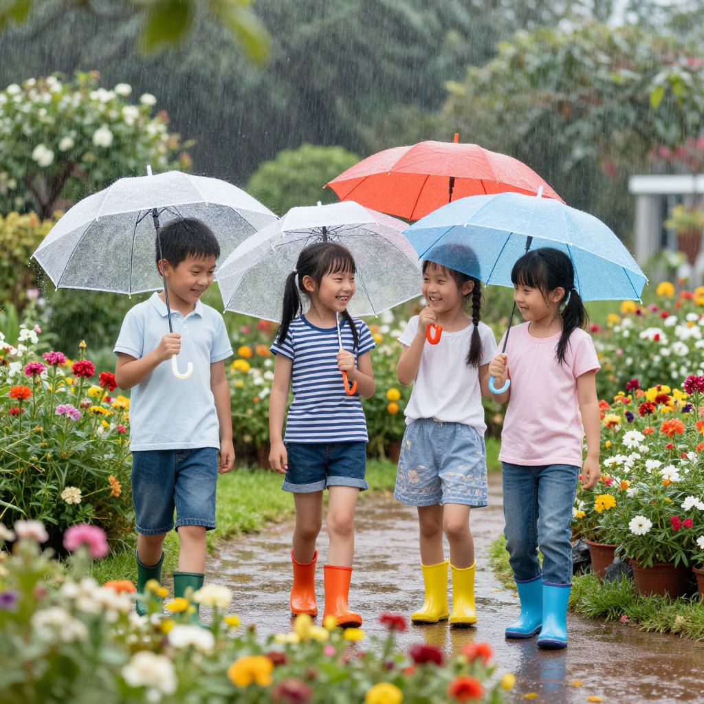 Children playing joyfully in a garden under a gentle pitter rain, vibrant flowers blooming all around, bright daylight, smiling faces with umbrellas and rain boots, lively and heartwarming scene imbued with innocence and happiness