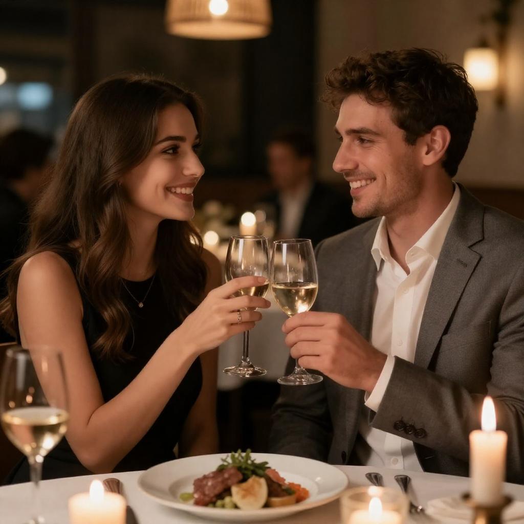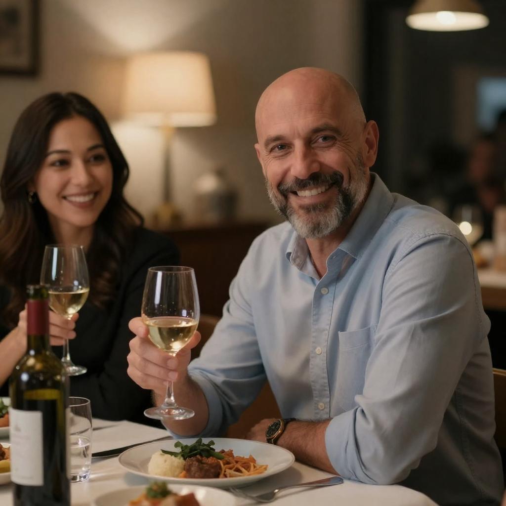 Photograph of a smiling middle-aged man with a bald head and beard, wearing a light blue shirt, and a woman with long dark hair, wearing a black top, sitting at a dimly lit dinner table. They hold wine glasses, with plates of food and a bottle of wine in front of them. Warm lighting from a lamp in the background.