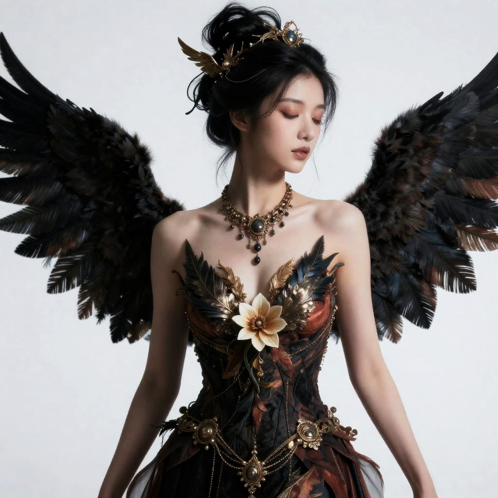 Portrait of an Asian woman wearing an elaborate phoenix-themed dress adorned with black and gold feathers, a central flower decoration, and intricate golden jewelry. She has black hair styled up with a decorative hairpiece and black feathered wings extending from her back, set against a plain white background.
