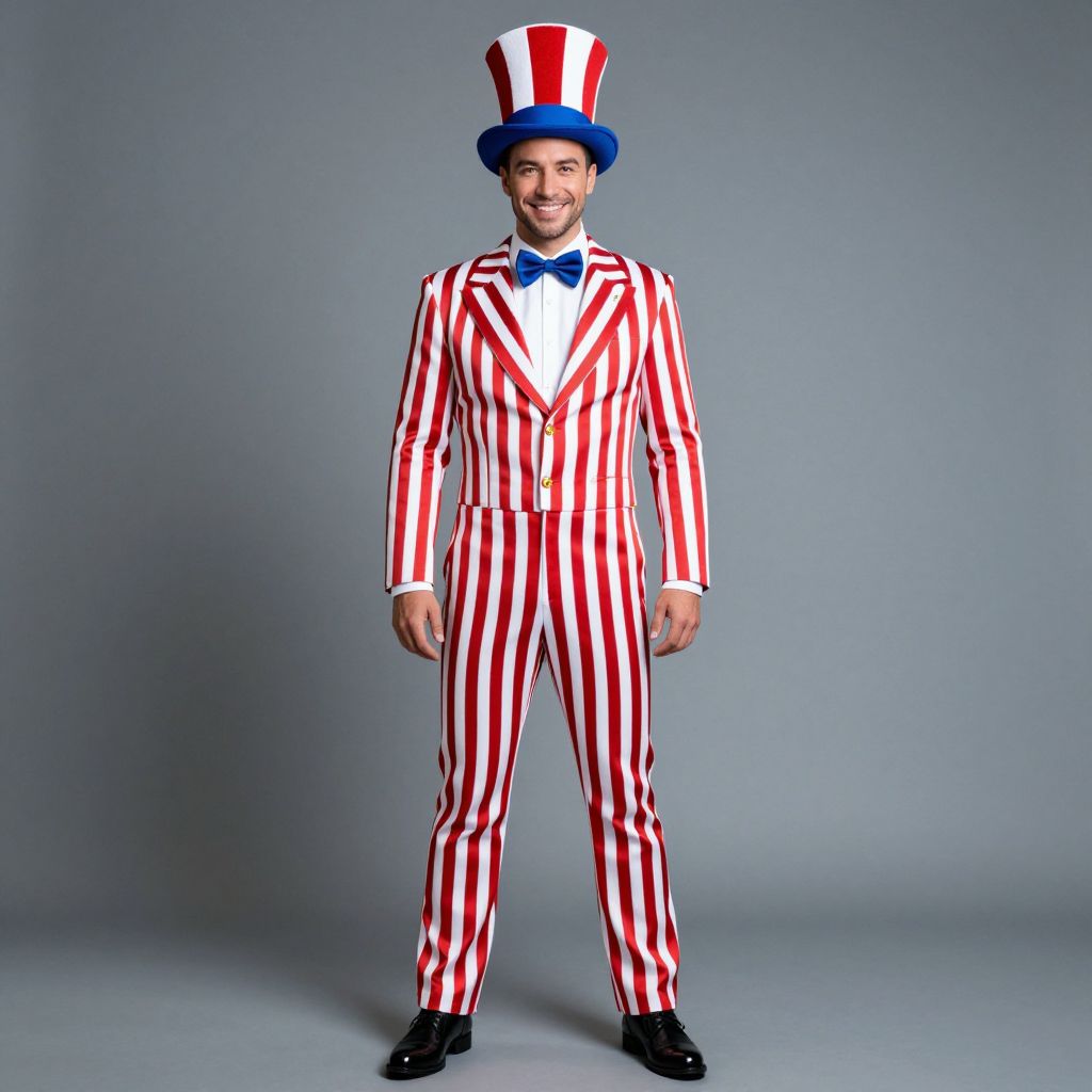 A handsome man in his early 30s with a confident smile, wearing a red, white, and blue hat, and a striking red and white striped outfit complete with a perfectly tied bow tie. Cinematic, vibrant colors, full body shot.