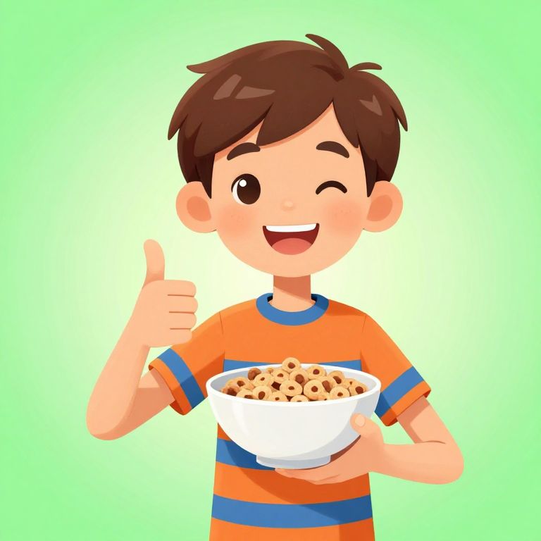 Digital cartoon illustration of a happy, young boy with short brown hair, wearing an orange and blue striped shirt. He has a light skin tone and is winking with his right eye while smiling widely, showing a small tooth. His right hand is giving a thumbs-up, and his left hand holds a white bowl filled with cereal. The background is a gradient of light green to yellow. The boy's expression and body language convey excitement and satisfaction. The style is bright, colorful, and simple, with smooth, clean lines and a cheerful, child-friendly aesthetic.