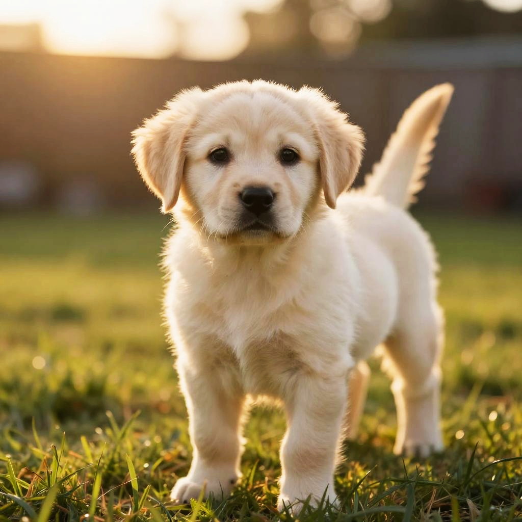 Cute 13 young puppy with floppy ears, wagging tail in a grassy backyard, golden light from sunset, highly detailed fur and expressive eyes, heartwarming scene
