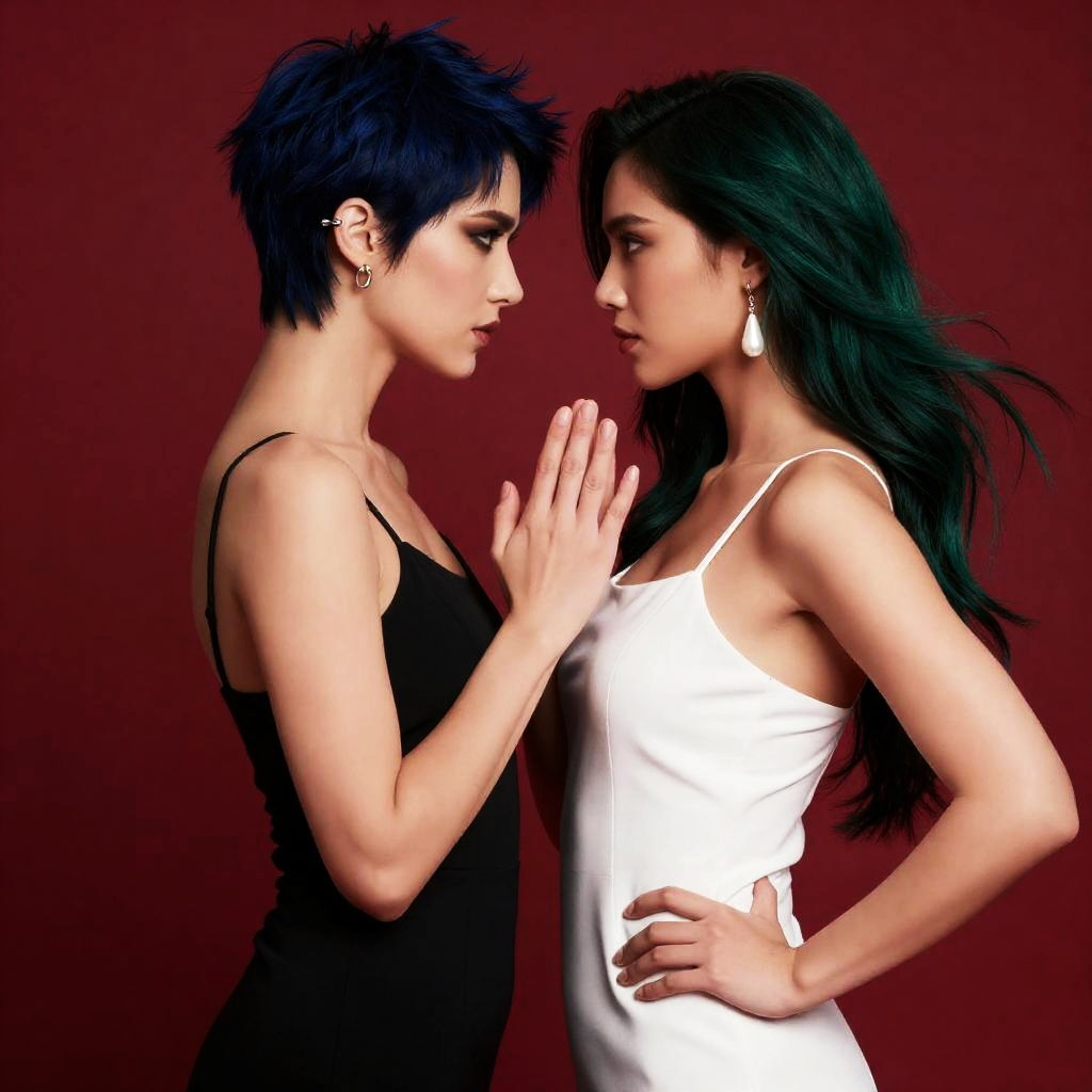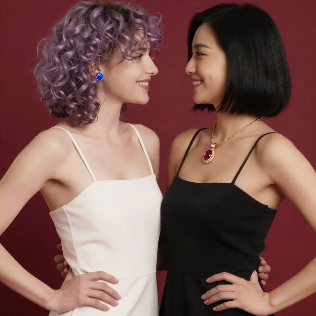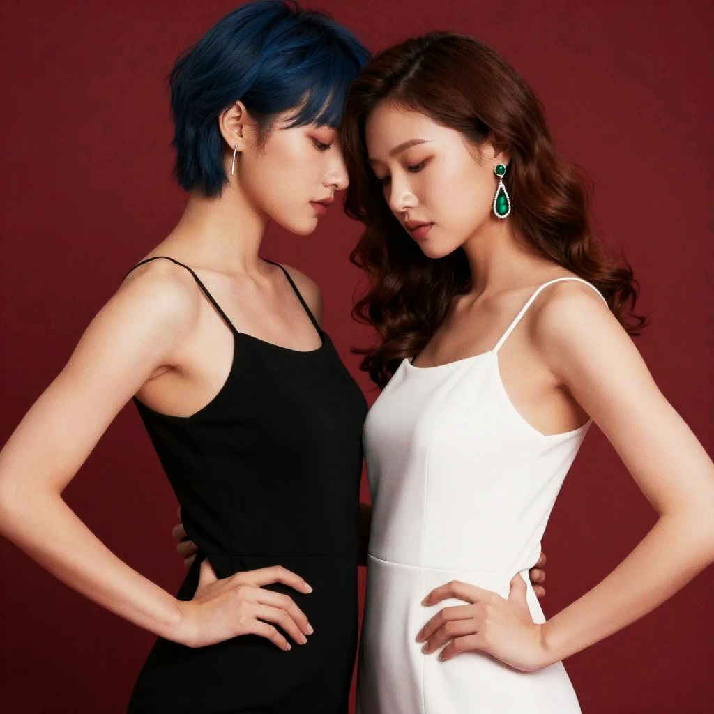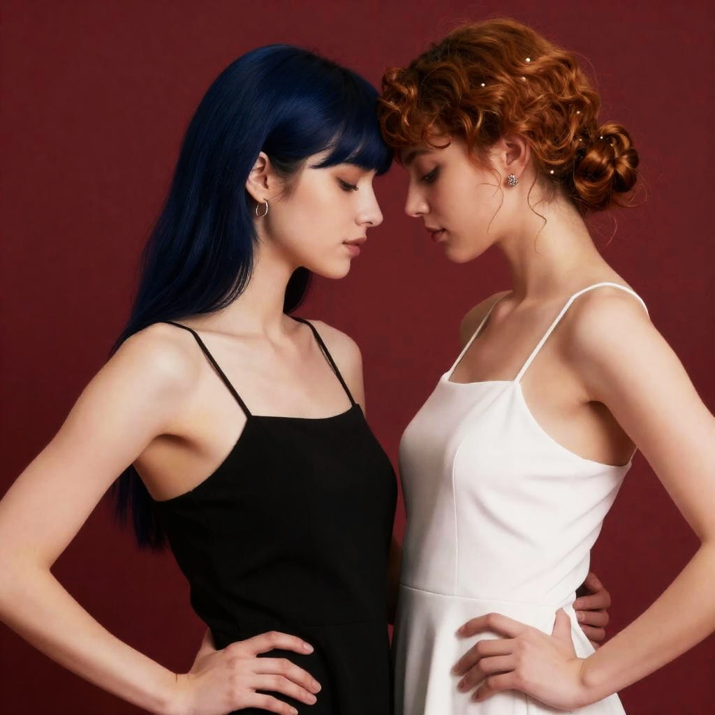 Upper body, 2girls, couple, confident young woman with short fiery red curls and emerald stud earrings, reserved girl with straight ash brown hair tied in a low ponytail and subtle rose gold hoops, black dress, white dress, sleeveless, spaghetti strap, bare shoulders, jewelry, earrings, arm around waist, hand on another's hip, hand on another's waist, breast press, gentle cheek-to-cheek lean, soft hand squeeze, red background