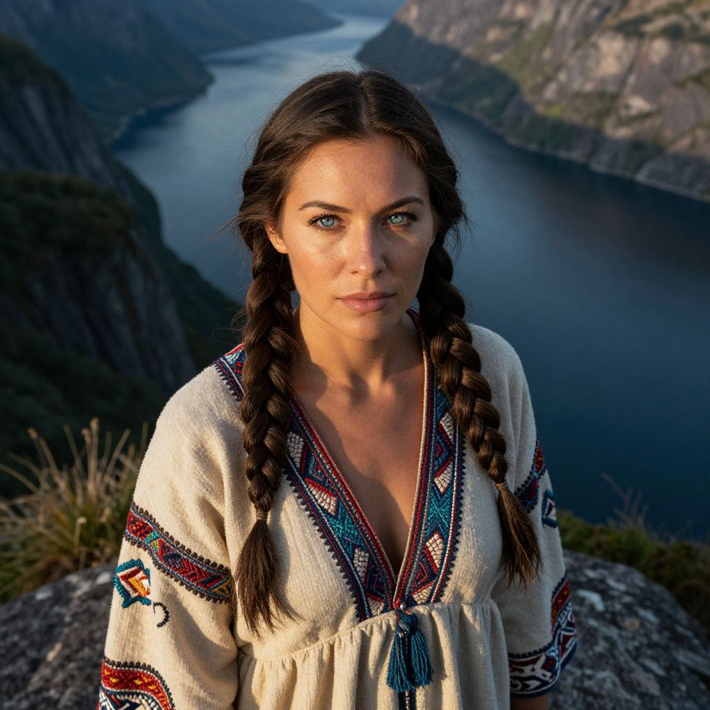 A captivating portrait photograph showcases an enigmatic Pacific Islander woman with piercing blue eyes and delicate features. Adorned in a flowing Viking-inspired dress intricately embroidered, she stands amidst a tranquil fjord's lush landscape from an unusual high angle. Soft golden light bathes her face, casting gentle shadows across the rich textures of her garments and intricate braids. This serene yet evocative scene conveys strength, resilience, and a deep connection to ancestral heritage and nature's untamed beauty.