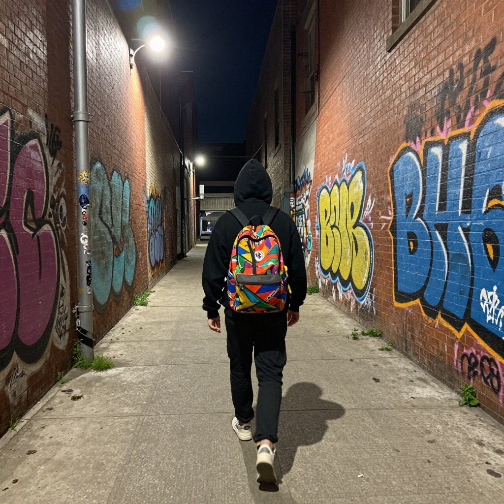 A person wearing a black hoodie and a colorful backpack walks down a narrow alley lined with brick walls covered in vibrant graffiti artwork. The alley is illuminated by bright overhead streetlights, casting long shadows on the concrete pavement. Small patches of grass grow between the pavement slabs, enhancing the urban atmosphere of the scene at night.