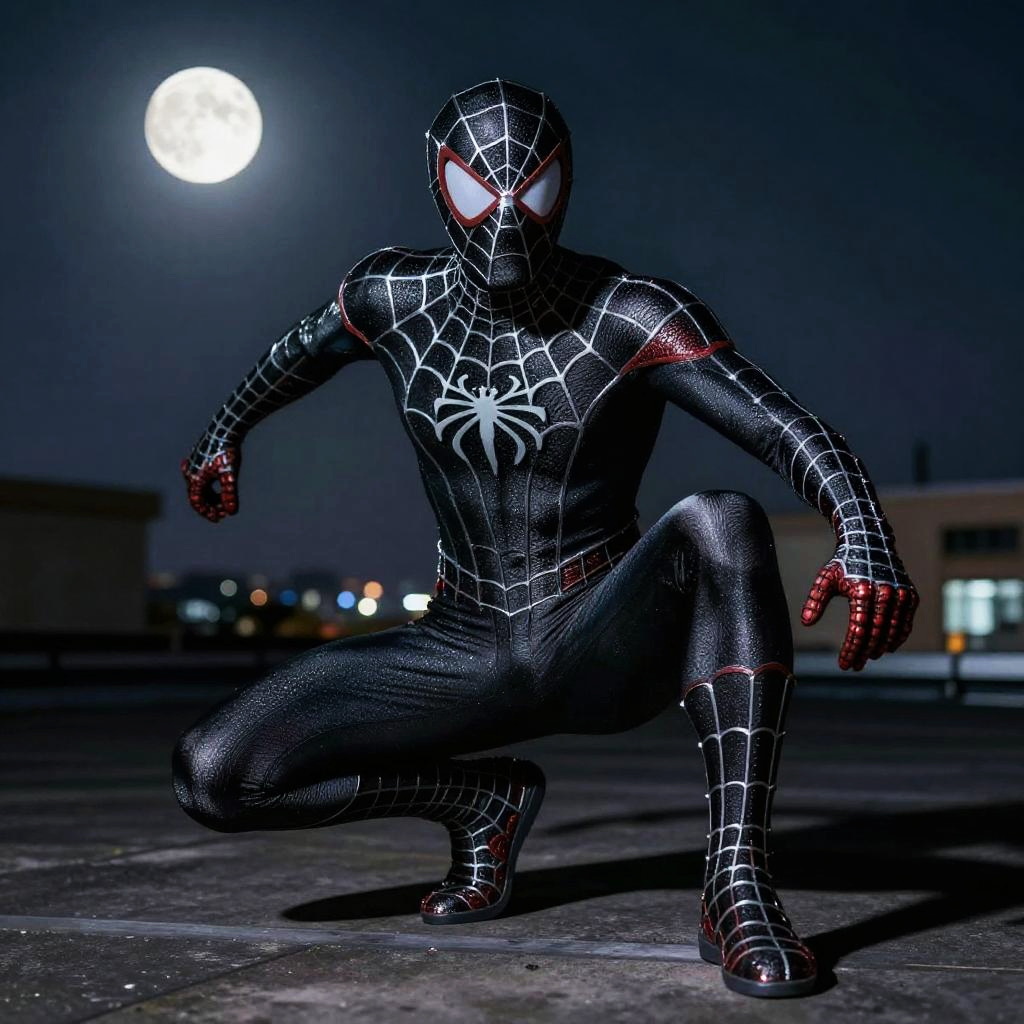Spider silk suit worn by a stealthy superhero, black and silver threads shimmering, textured weaving, dynamic pose on rooftop at night with a full moon, cinematic lighting