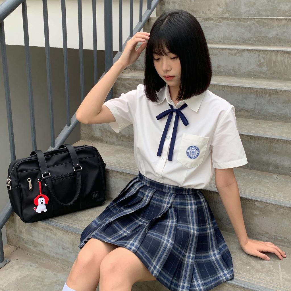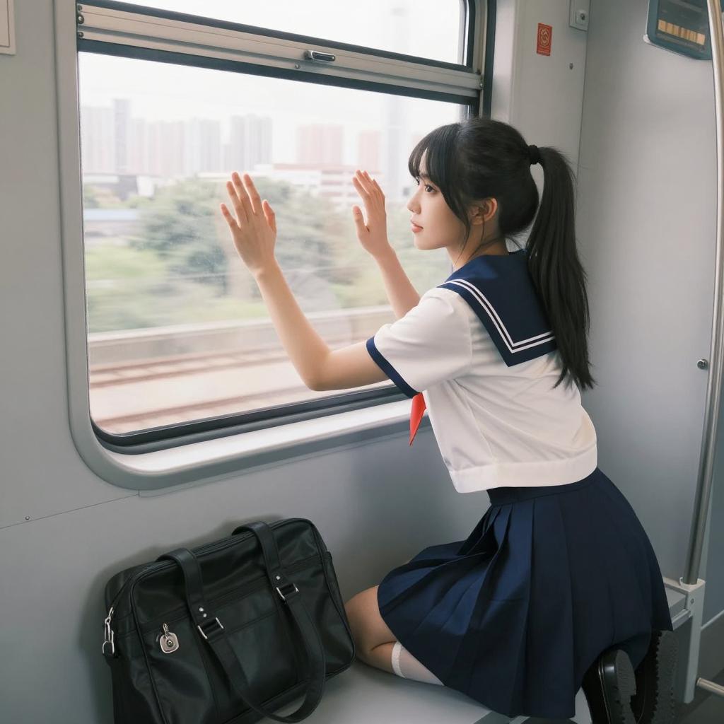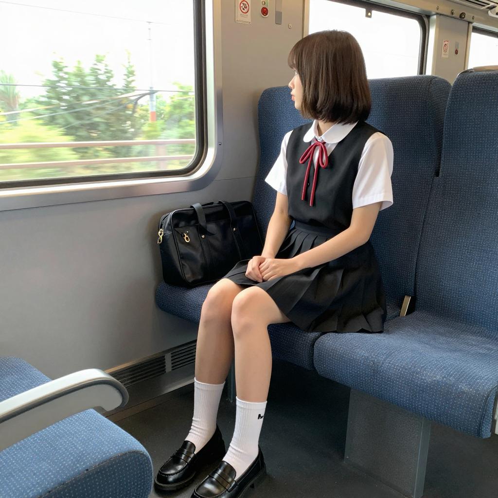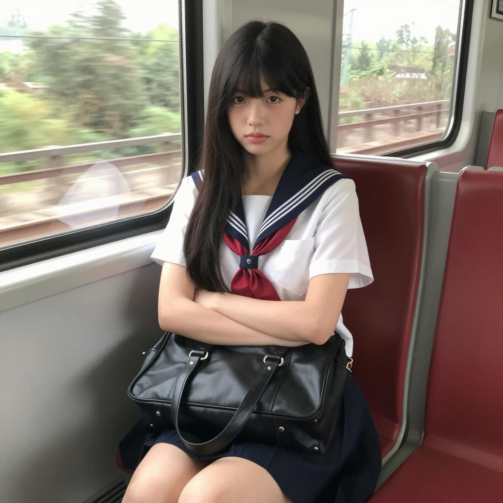 Japanese schoolgirl with short brown hair, white blouse, black pinafore, red ribbon, black pleated skirt, white socks, black loafers, sitting on blue patterned train seat, black bag on lap, facing left, sunlight through window. Train interior.