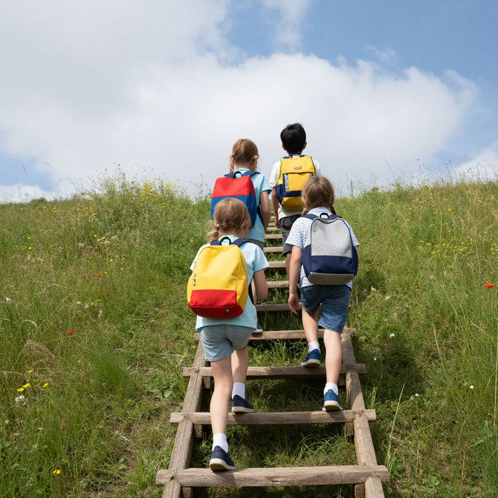 Photograph of five children walking up a wooden staircase in a grassy field under a partly cloudy blue sky. The children, from left to right, wear colorful backpacks: yellow and red, blue, yellow, gray, and blue. They are dressed in casual summer clothes, including shorts and t-shirts. The grass is green with scattered wildflowers, and the wooden steps are weathered. The children are viewed from behind, ascending the steps towards the top of the hill, creating a sense of adventure and exploration.