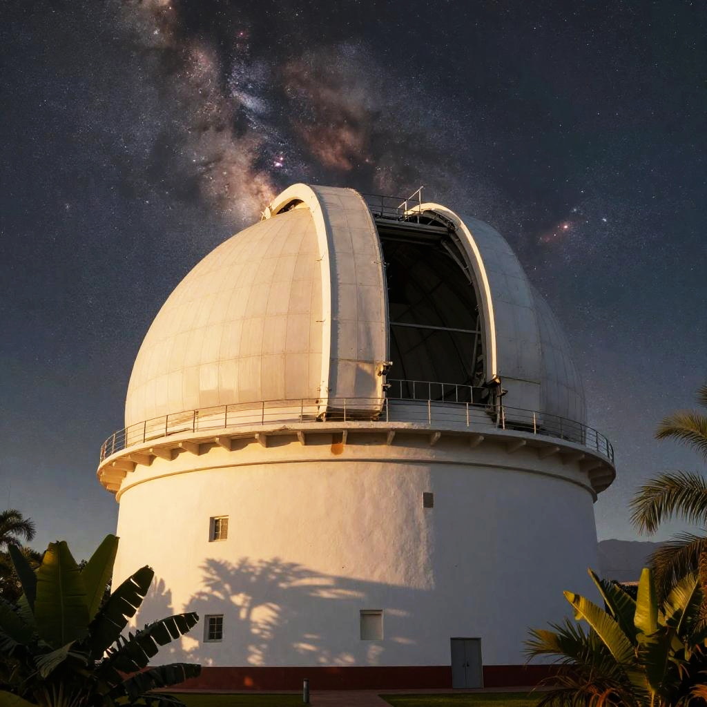 Tonantzintla 618 observatory interior, featuring classic 20th-century astronomical equipment, wooden paneling, and large telescope lenses gleaming under soft lighting, evoking a nostalgic scientific atmosphere with a cosmic background visible through tall windows.
