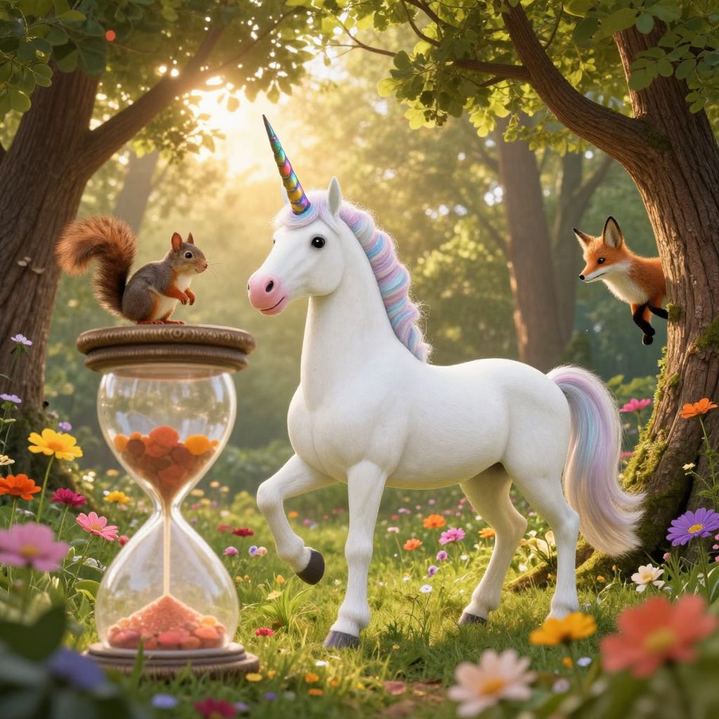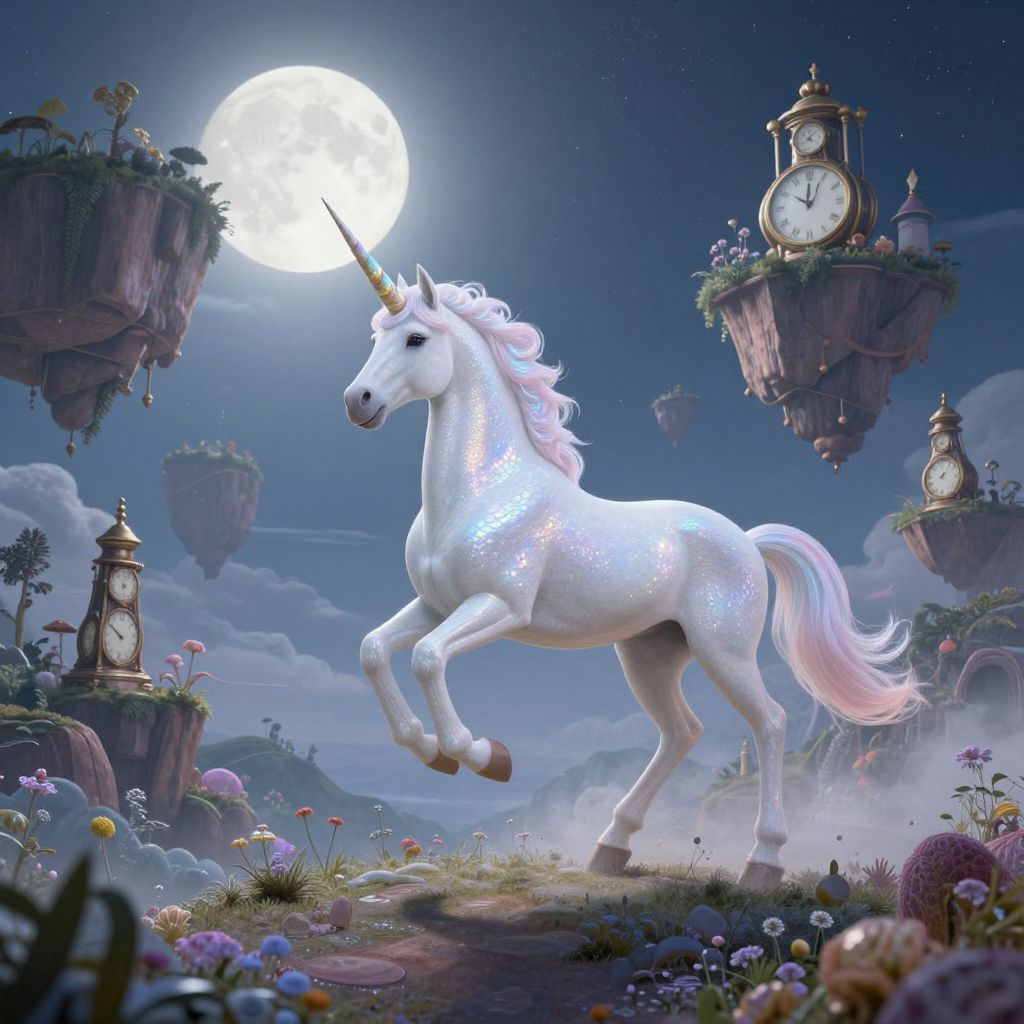 Digital artwork of a glowing, ornate white unicorn with blue accents, prancing on a crystalline hourglass, surrounded by water and colorful reflections.