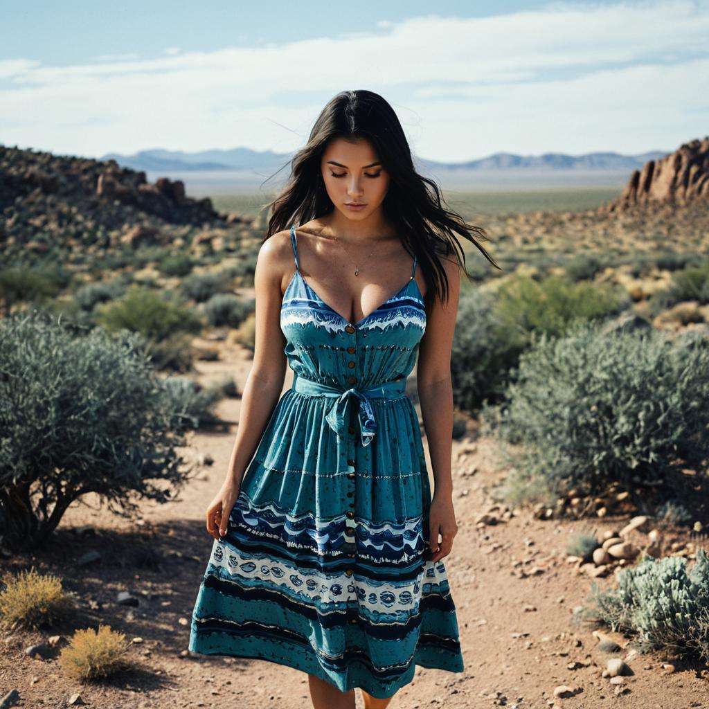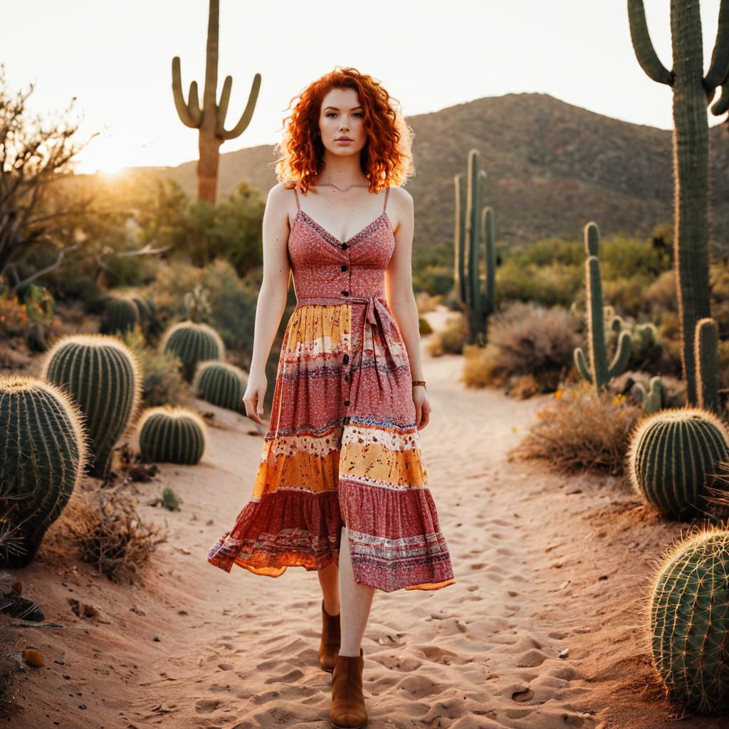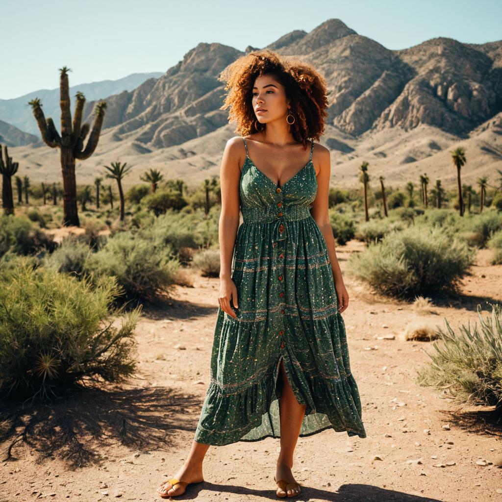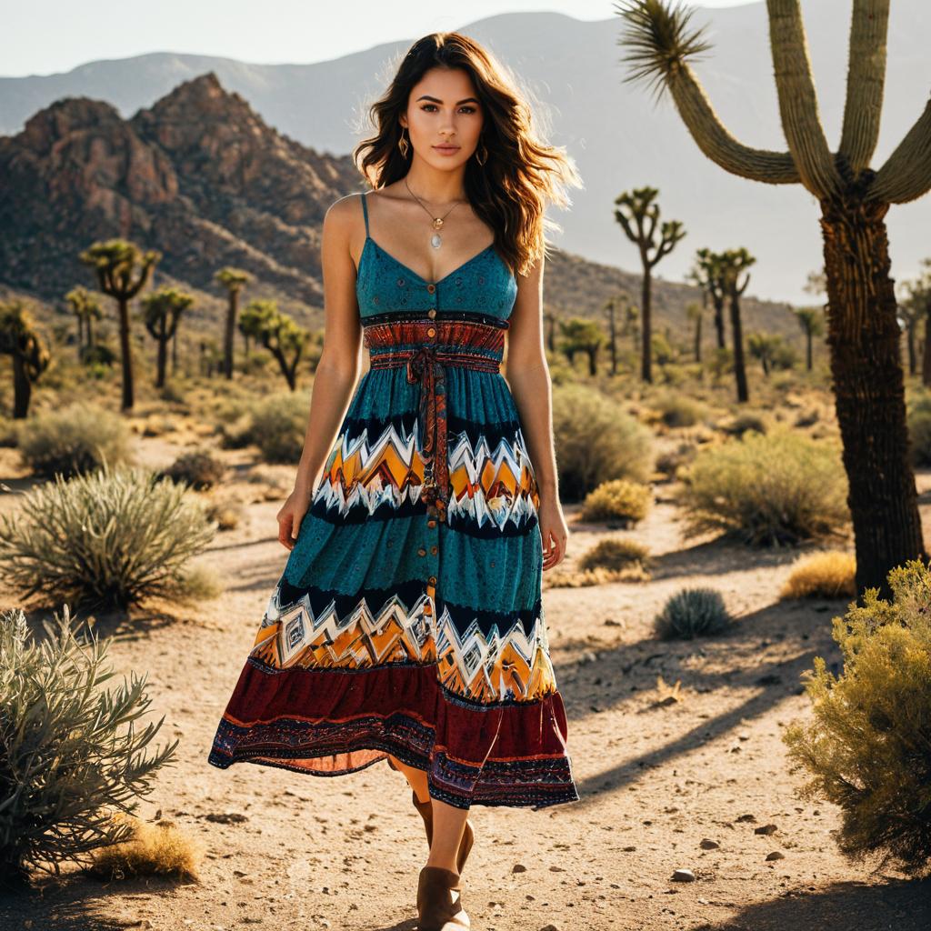 1girl, cleavage, large breasts, woman wearing colorful abstract print spaghetti strap button-front midi sundress with tie waist in bold multicolor jewel tones on woman with long wavy blonde hair and light tan posed walking slowly toward the camera with dress flowing and one foot slightly lifted in desert overlook with layered mountains fading into haze, backlit sunlight creating a subtle rim light around her silhouette, bohemian outdoor fashion photography, shallow dof