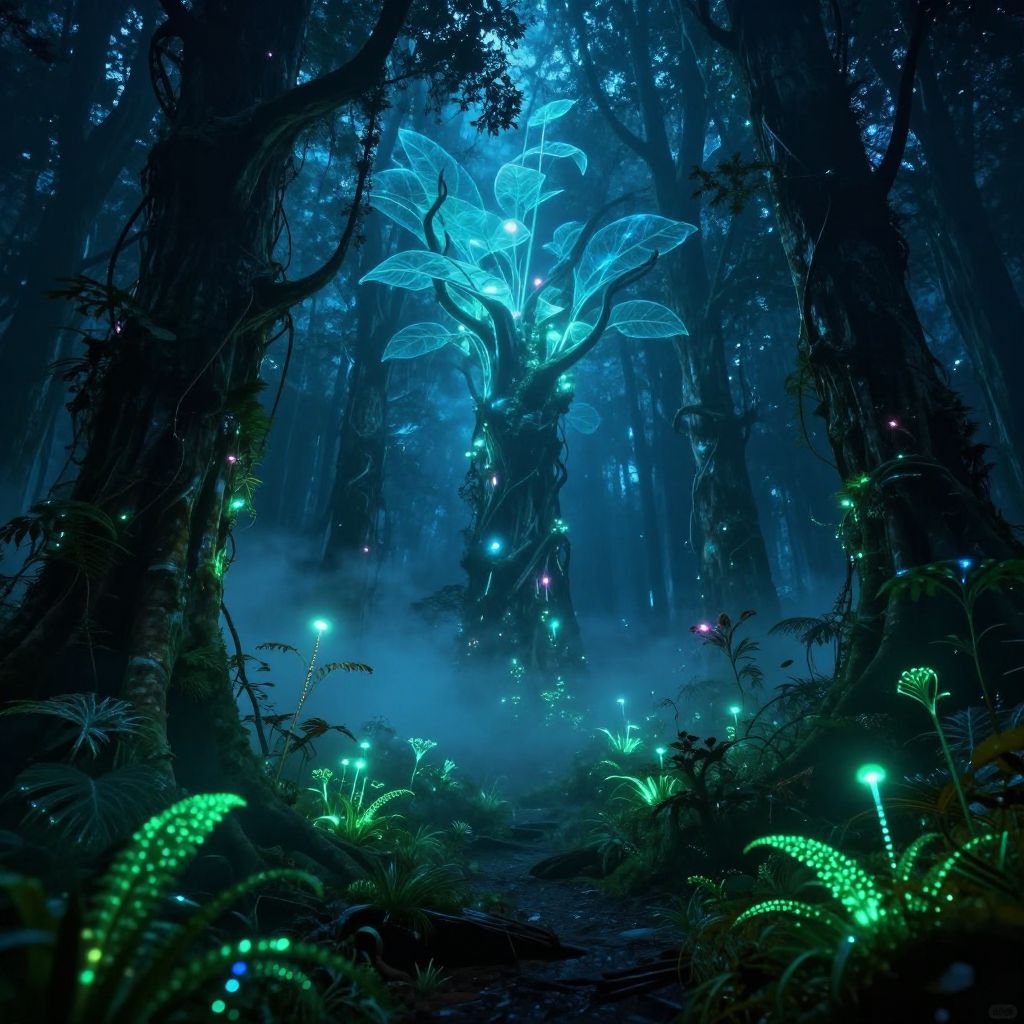 Alien forest glowing with bioluminescent plants, strange towering trees with translucent leaves, mist swirling at ground level, neon colors, otherworldly atmosphere, cinematic lighting
