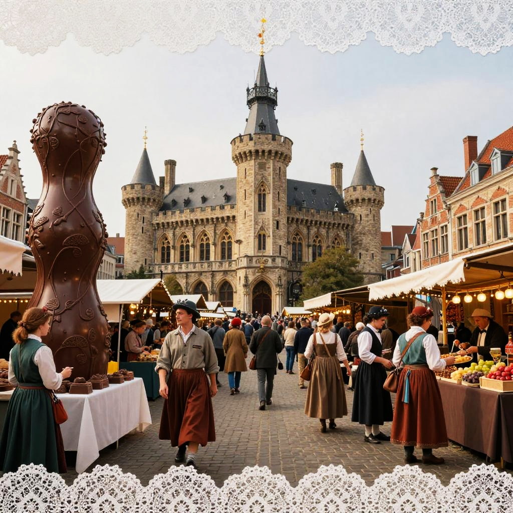 Belgian stereotypes captured in a bustling market square featuring lace patterns, surreal giant chocolates, medieval castles, and people wearing traditional Flemish and Walloon attire, warm lighting.