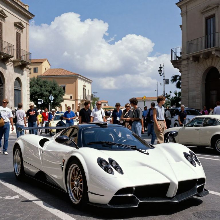 Photograph of a white, sleek, modern sports car parked in a sunny, European street, surrounded by a crowd of people and other cars.