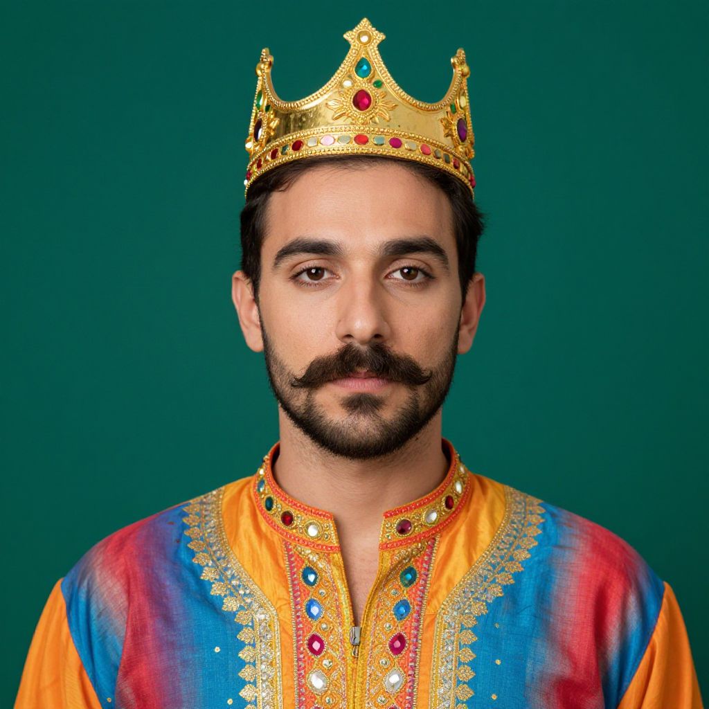 A man with a mustache and a beard is wearing a colorful outfit with a crown on his head.