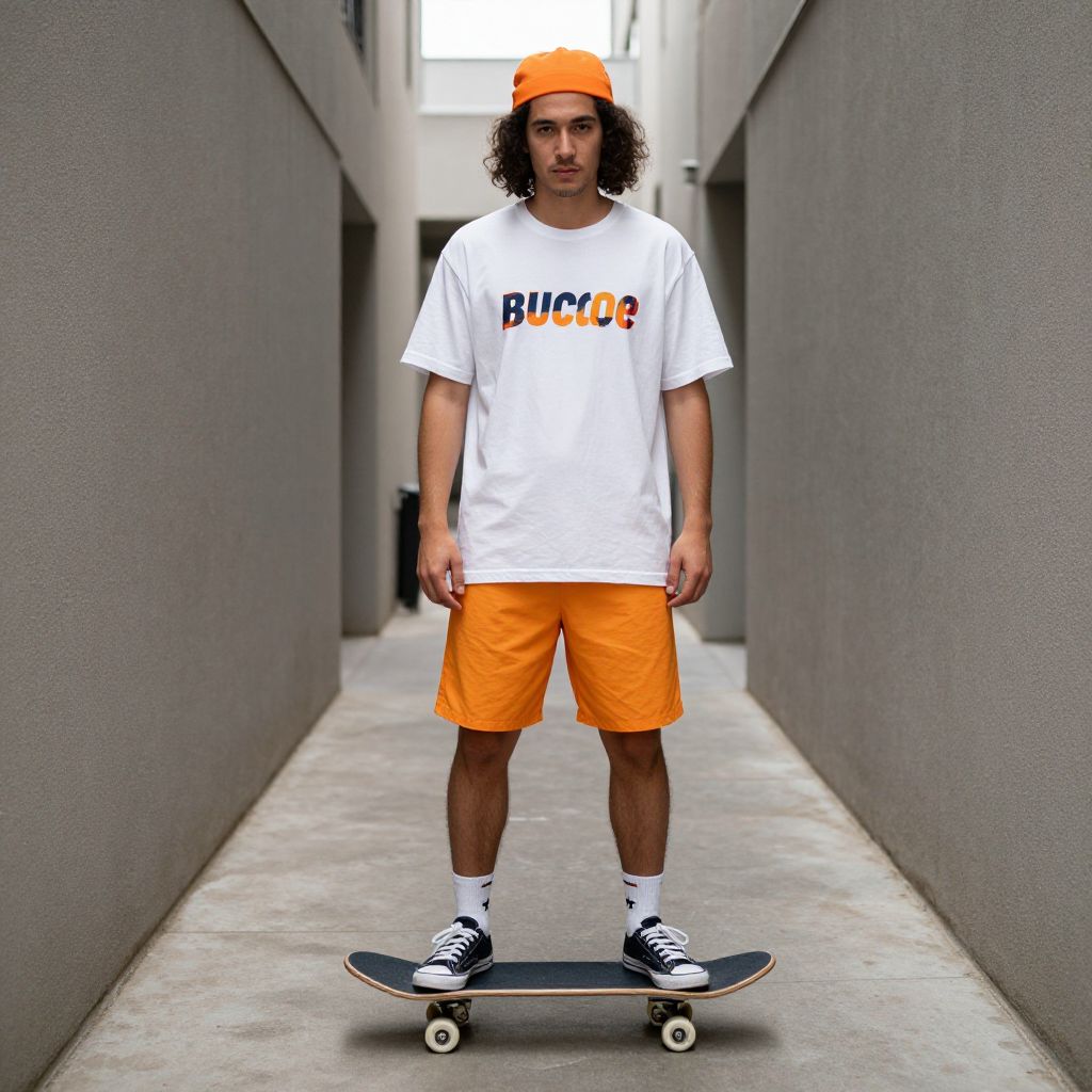 Shorts Costume, man standing on a skateboard in a narrow alleyway