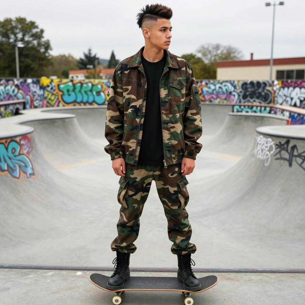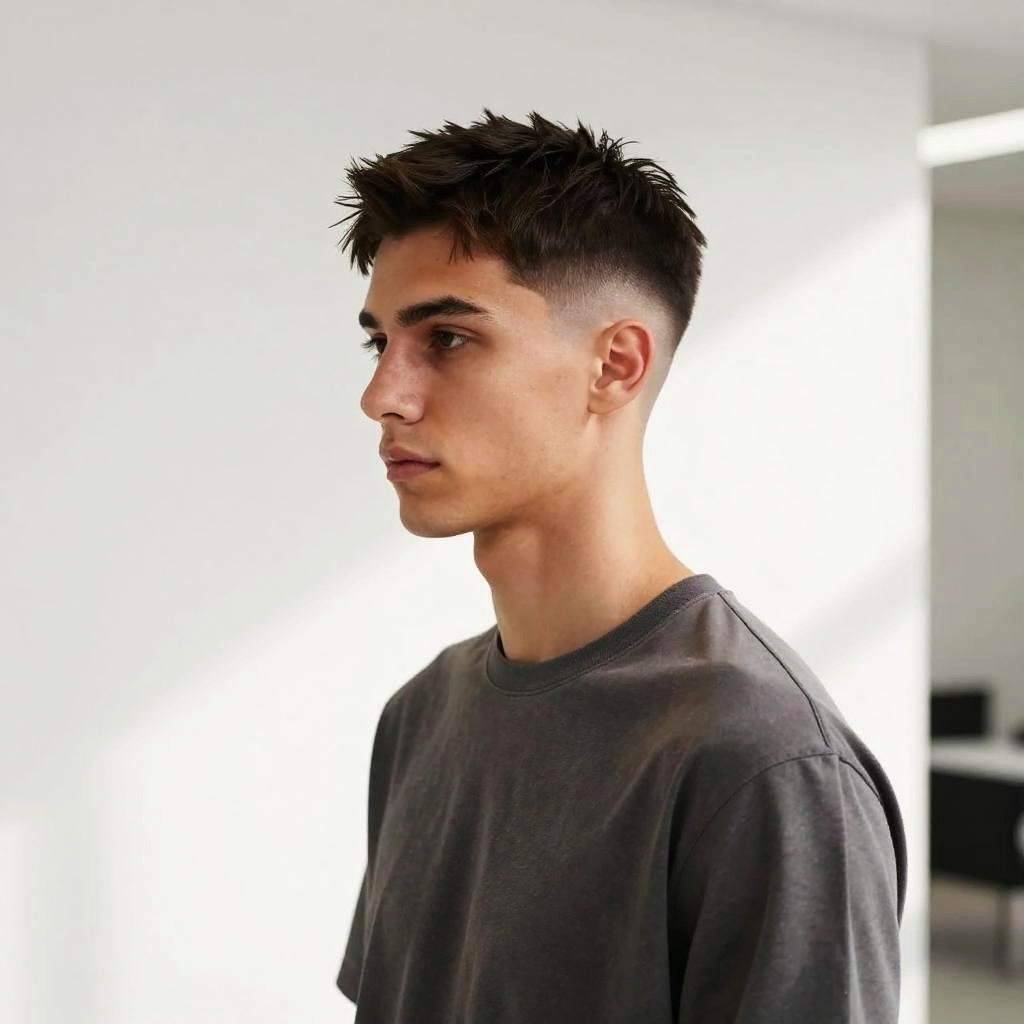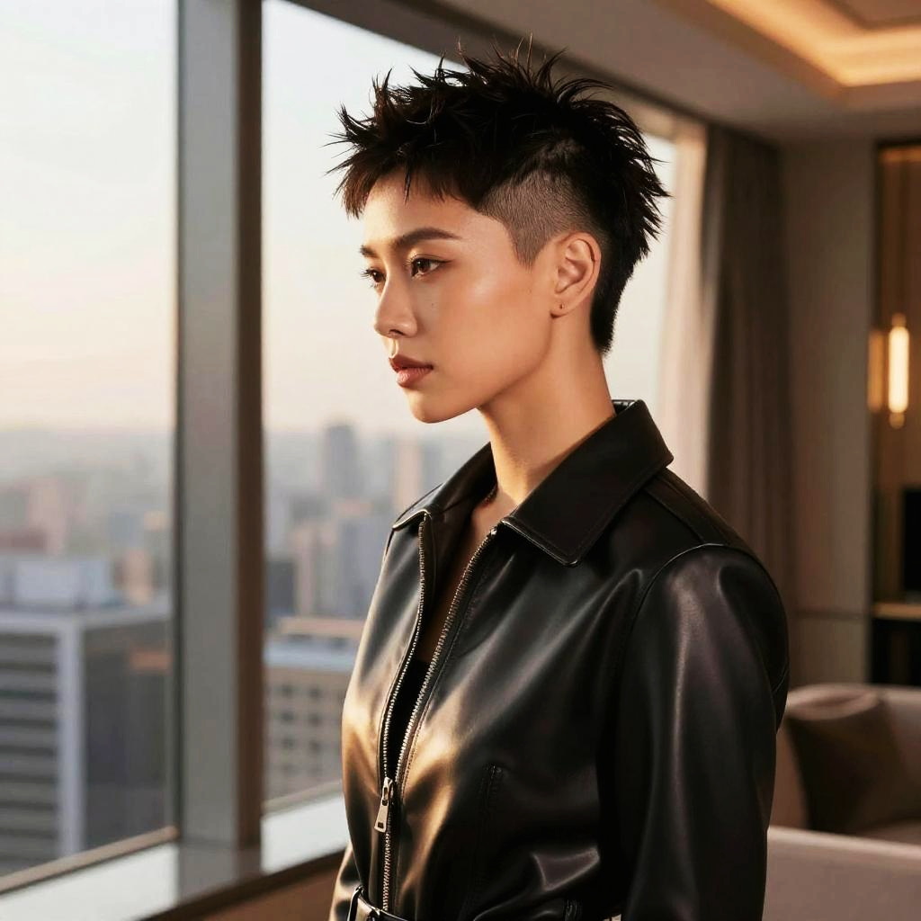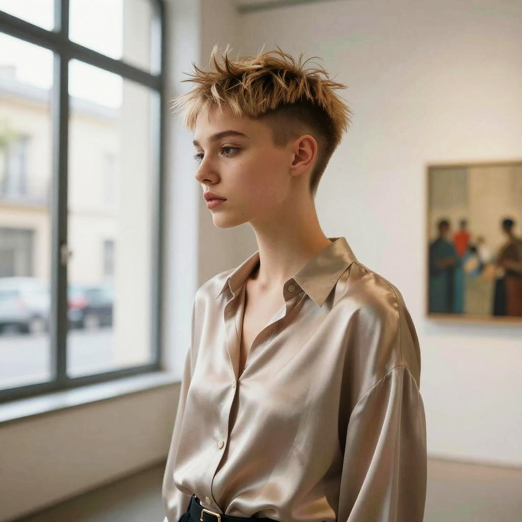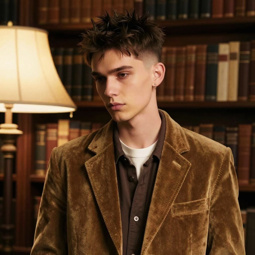Faux Hawk Fade hairstyle on fashion model, wearing vintage corduroy blazer, in old library, captured in fashion editorial style with muted warm lamp light.