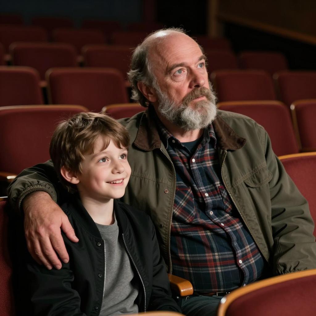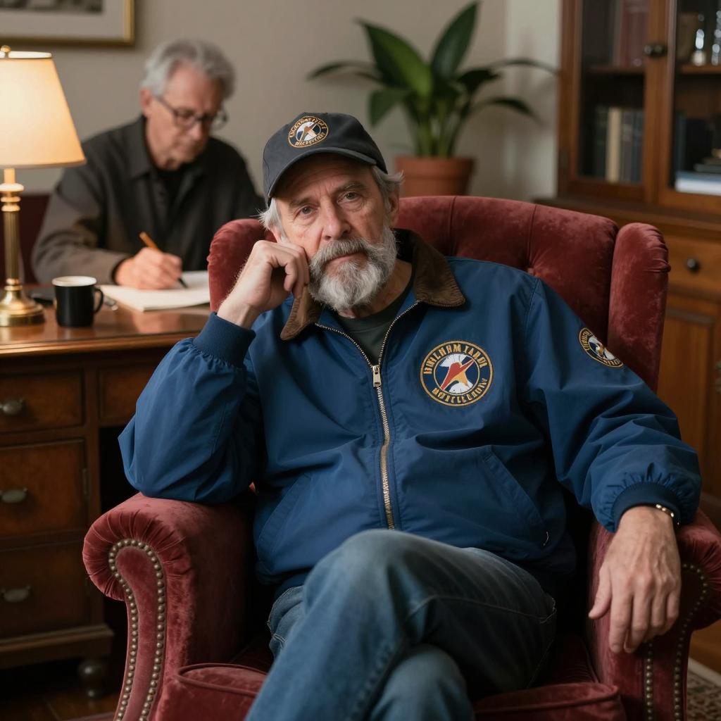 Man with blue "Baltimore" jacket, cap, beard, and mustache sits in red armchair, hand on cheek. Older man with glasses and grey hair works at wooden desk in background. Lamp, plants, and wooden furniture in dimly lit room.