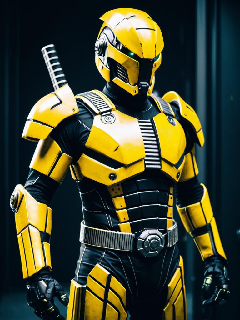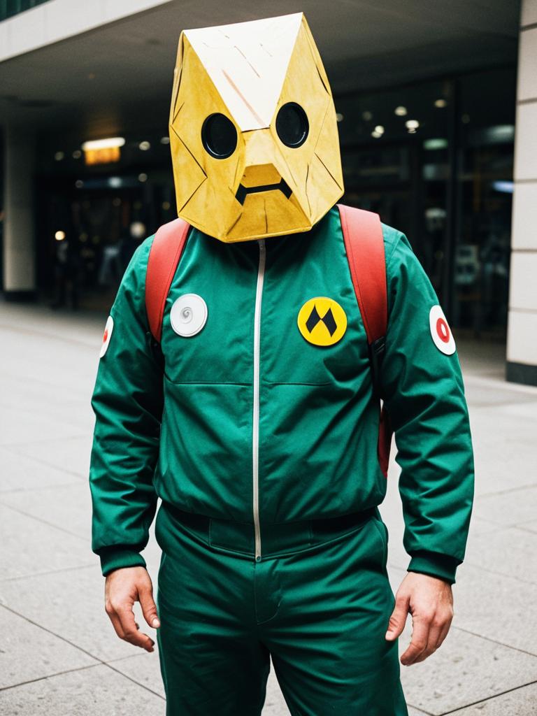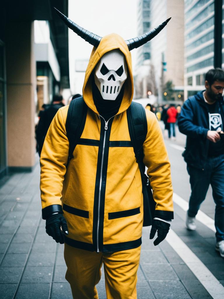 Portrait of a man wearing a Chip Hazard cosplay costume with a detailed yellow and black jumpsuit and a white helmet featuring large black eye shapes. The man stands indoors with hands on hips in a modern office-like setting, showcasing the futuristic and bold design of the outfit.
