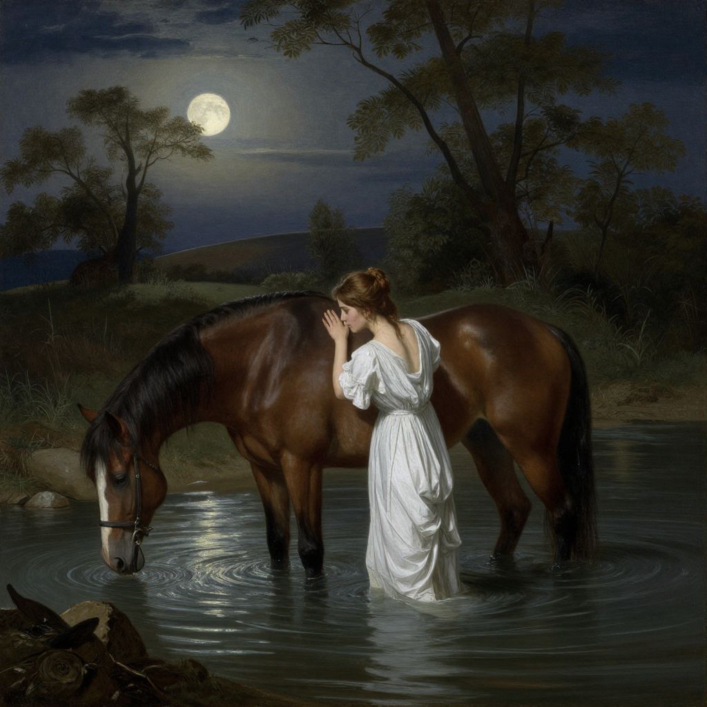 This digital painting depicts a serene nighttime scene with a full moon illuminating a dark, forested landscape. A woman with fair skin and brown hair, dressed in a white, flowing, classical-style gown, stands in a shallow pond, gently touching the dark brown horse's head. The horse is drinking water, creating ripples around its legs. The background features silhouetted trees and a distant hill under a starry sky. The moonlight casts a soft glow on both the woman and the horse, highlighting their calm and intimate connection. The artist's use of dark and light contrasts adds depth and tranquility to the scene.