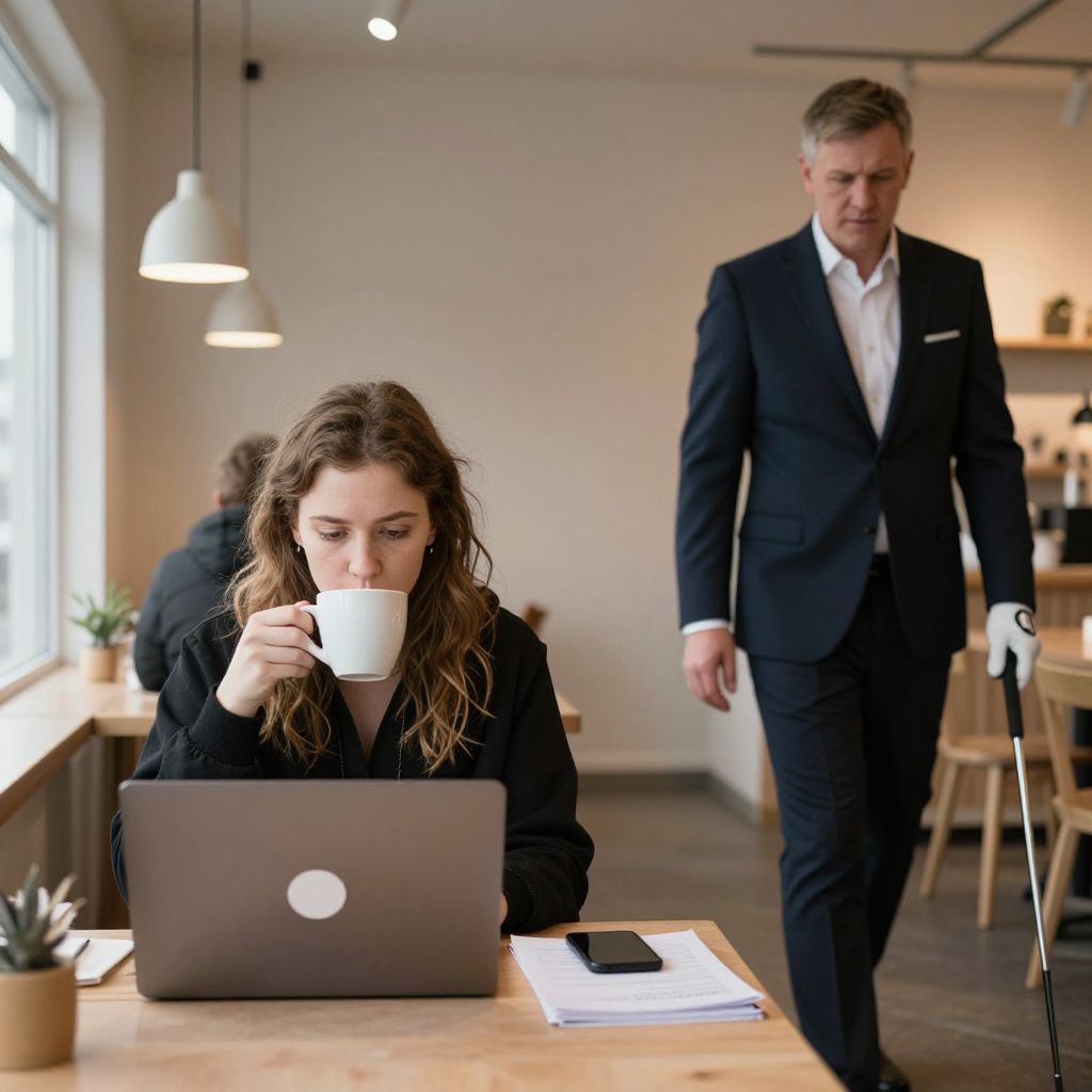Photograph of a modern, bright café. A young woman with wavy brown hair, wearing a black blouse, sits at a wooden table, sipping from a white cup, focused on a silver MacBook with a white circular logo. She has a black smartphone and a stack of papers beside her. In the background, a middle-aged man with short gray hair, dressed in a black suit and white shirt, walks with a cane, looking forward. The café has large windows on the left, pendant lights hanging from the ceiling, and a minimalist, light wooden interior.