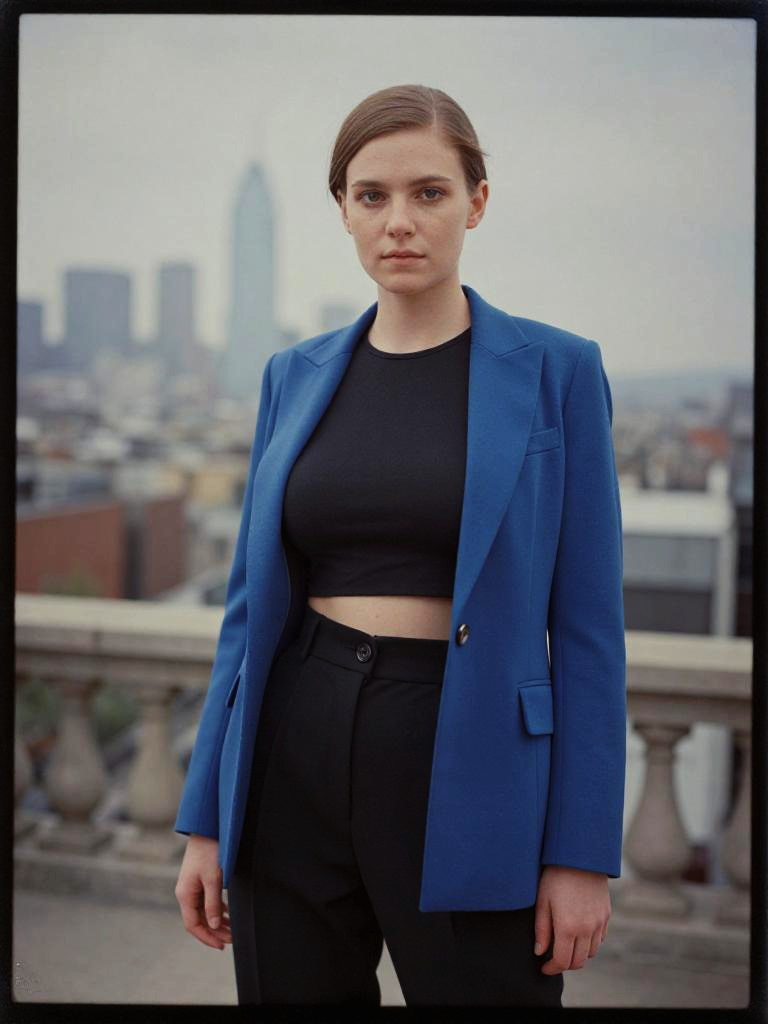 A slim woman in a royal blue blazer, cropped black top, and high-waisted black trousers, captured in the visual style of the Calotype process, standing at an art gallery terrace with a skyline backdrop. Sexy. Pretty face and beаutiful eyes. Big breasts
