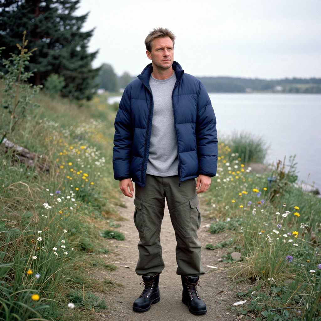 Photograph of a tall, muscular Caucasian man with short, light brown hair and a beard, standing on a dirt path beside a lakeside. He wears a navy blue puffer jacket, white t-shirt, olive green cargo pants, and black boots. The background includes tall grass, wildflowers, and a calm lake with trees on the far shore. The overcast sky casts a soft light, creating a serene, natural setting. The man looks directly at the camera with a neutral expression.