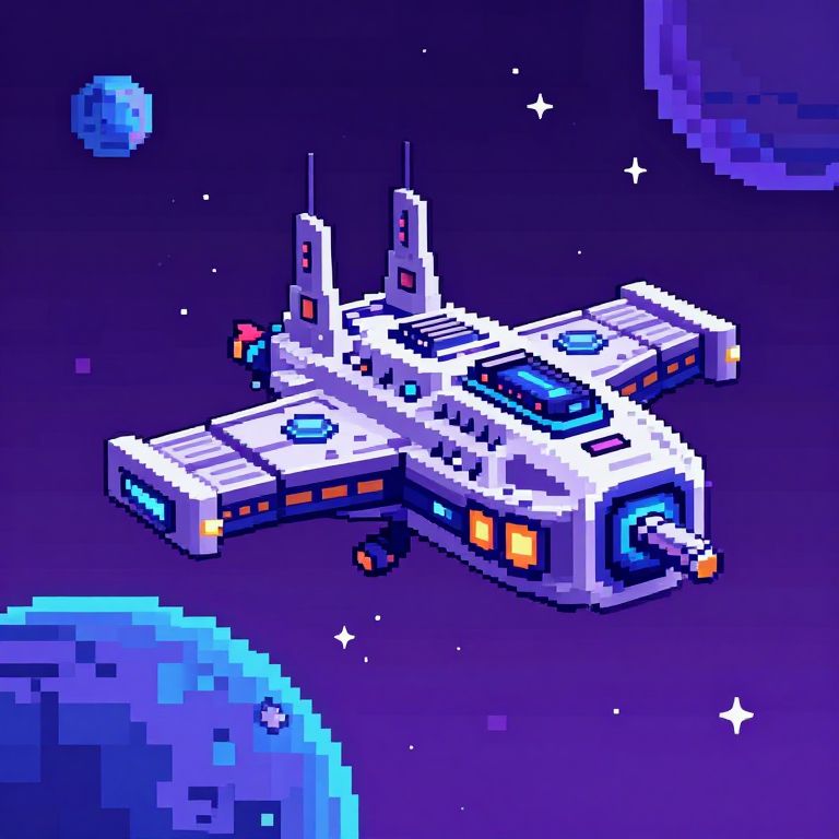 Pixelart futuristic spaceship flying over a pixelated alien planet, vibrant color palette with purple and blue hues, blocky pixel textures, stars twinkling in pixel sky, retro sci-fi video game style with detailed pixel design
