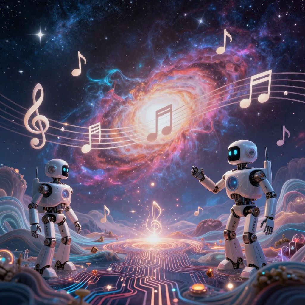 AI album cover generator free, surreal landscape with floating musical notes and AI-inspired robots, colorful cosmic background with stars and nebulas, intricate details with glowing circuits and waves, ethereal mood, imaginative and artistic