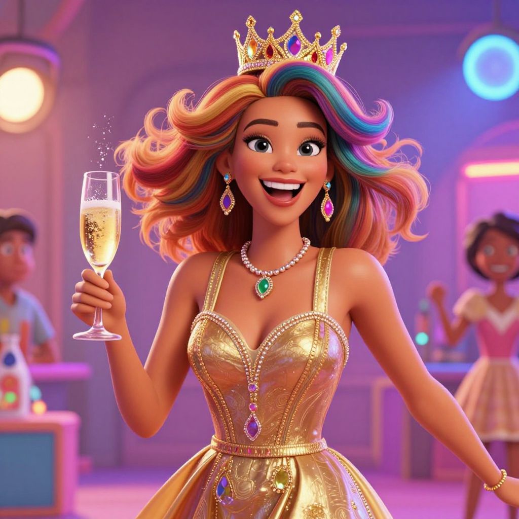 In this vibrant and lively scene, a woman exudes joy and elegance, her radiant smile illuminating the colorful, almost pixar-like atmosphere. She is adorned in a fashionable cocktail dress, its golden hue complementing her radiant skin. A glittering crown rests atop her head, adding a touch of regality to her already striking appearance. In her hand, she holds a glass of champagne, its bubbles sparkling under the bright, almost neon lights that fill the space. Her hair, a riot of colors, cascades down in a playful, voluminous style, while her accessories, including a necklace and earrings, shimmer with intricate designs. The background, a blend of warm and cool tones, creates a sense of depth and dimension, with soft, blurred lights adding to the dreamy, almost surreal quality of the scene. The overall composition is dynamic, with the woman as the central focus, her vibrant attire and accessories drawing the eye and creating a sense of movement and energy.