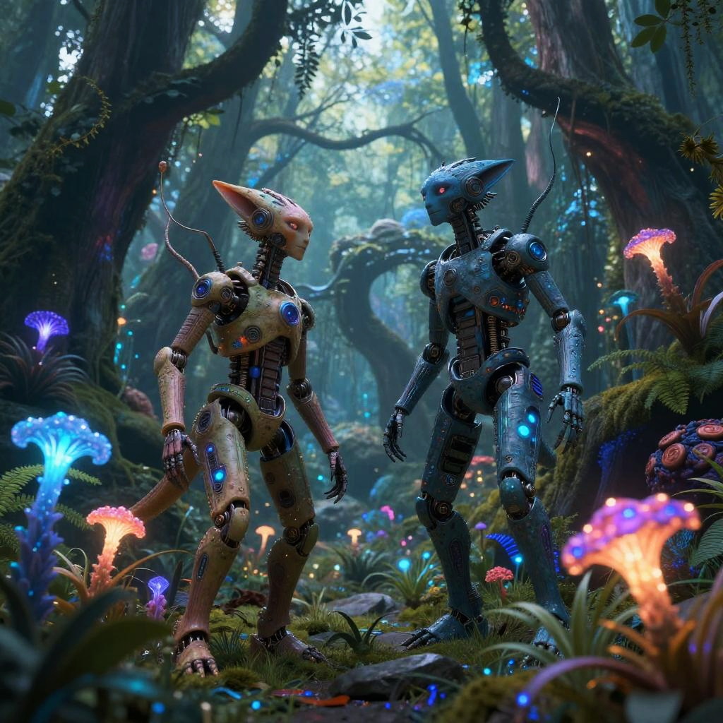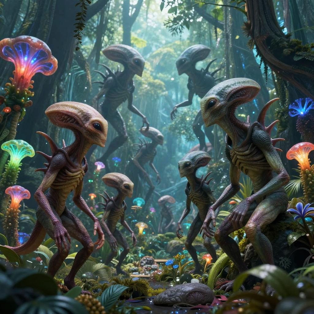 AI generated aliens interacting peacefully in a dense alien jungle, bioluminescent plants illuminating the scene, diverse alien species with unique anatomy and textures, surreal and colorful environment, ultra-detailed fantasy sci-fi composition.