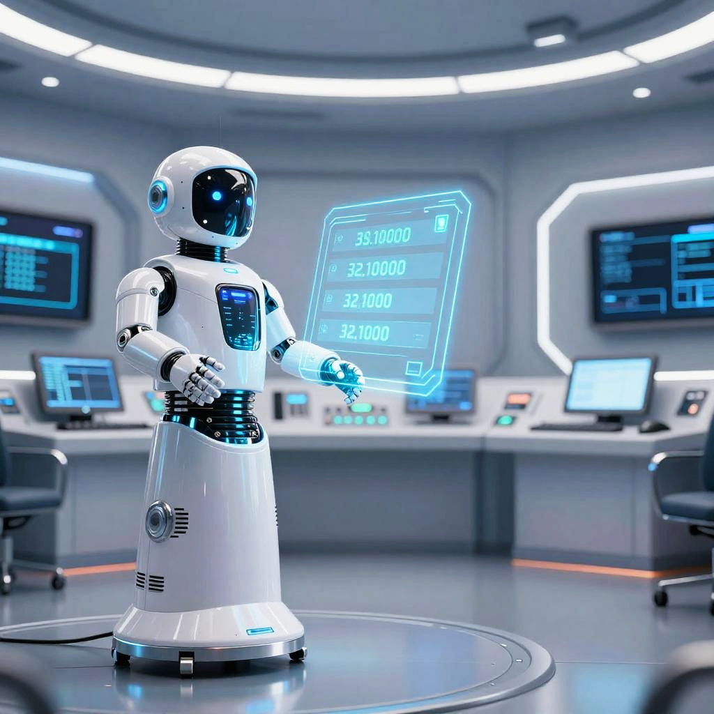 AI assistant hologram projecting telephone prompts in a high-tech control room, blue and white color scheme, polished metallic surfaces, futuristic design