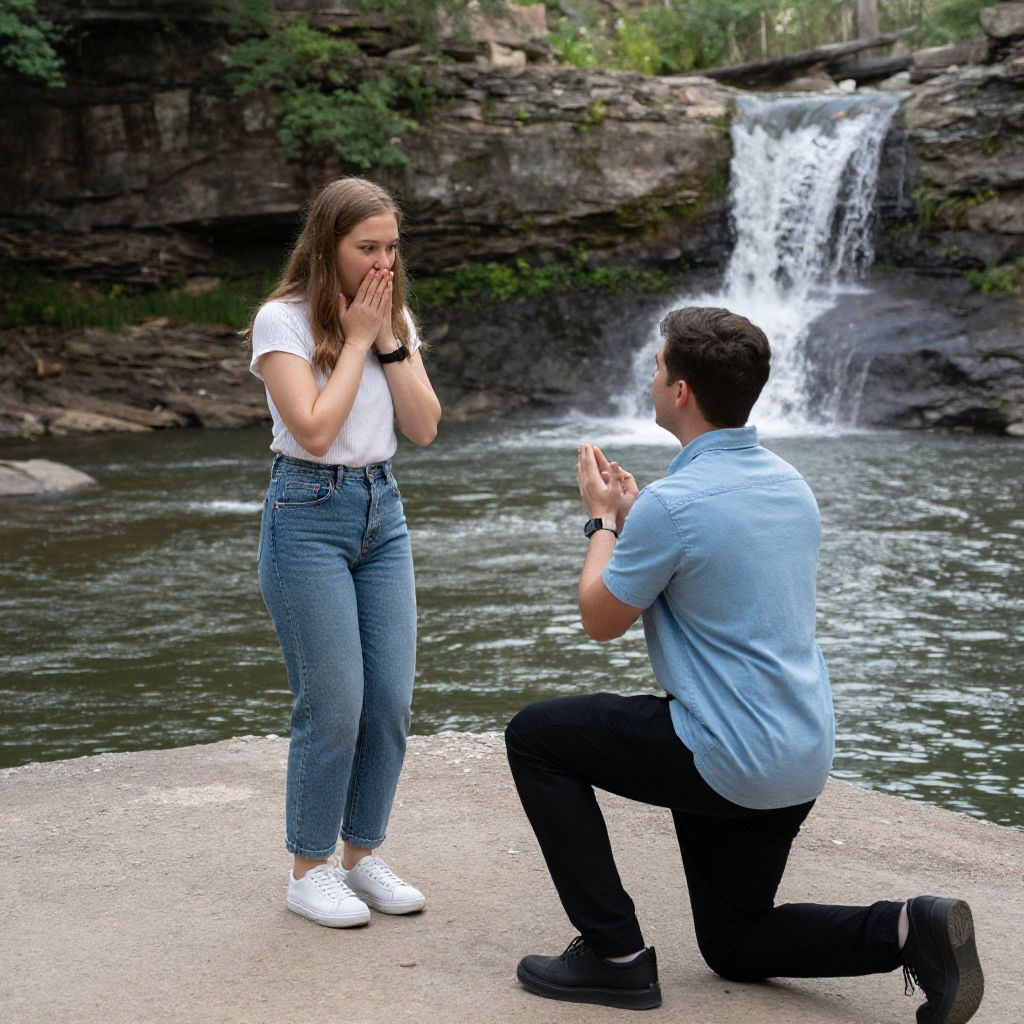 Surprised woman being proposed to at minnehaha falls