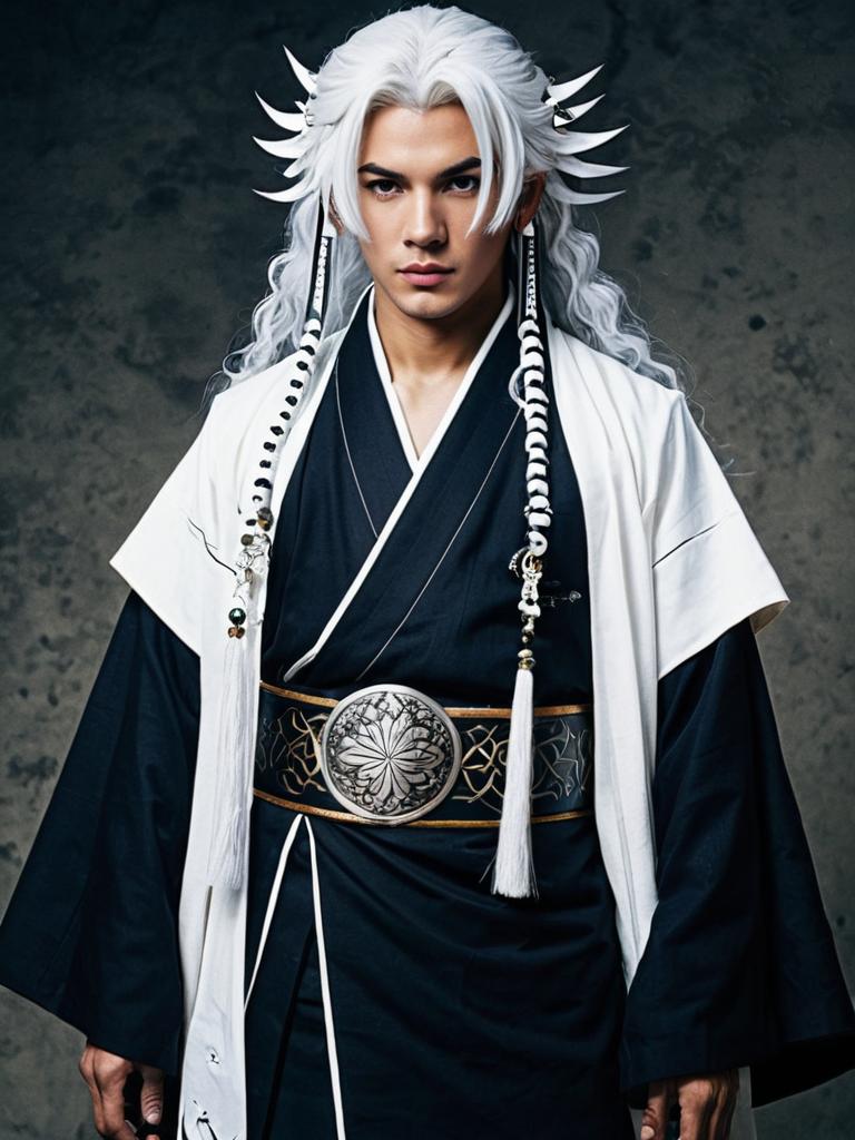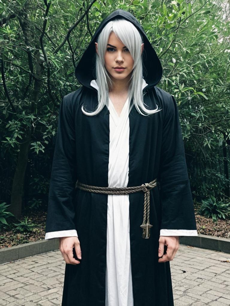 Photo-realistic cosplay photo of person in asclepius (fate) costume. 1boy, hair between eyes, green eyes, white hair, long hair, very long hair, grey hair, crossed bangs, black jacket, long sleeves, hood up. full body shot