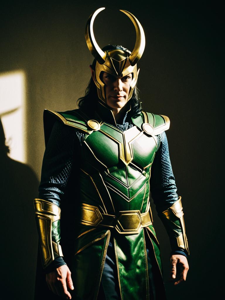 Man in Loki Costume, full-body cosplay photo with horned helmet