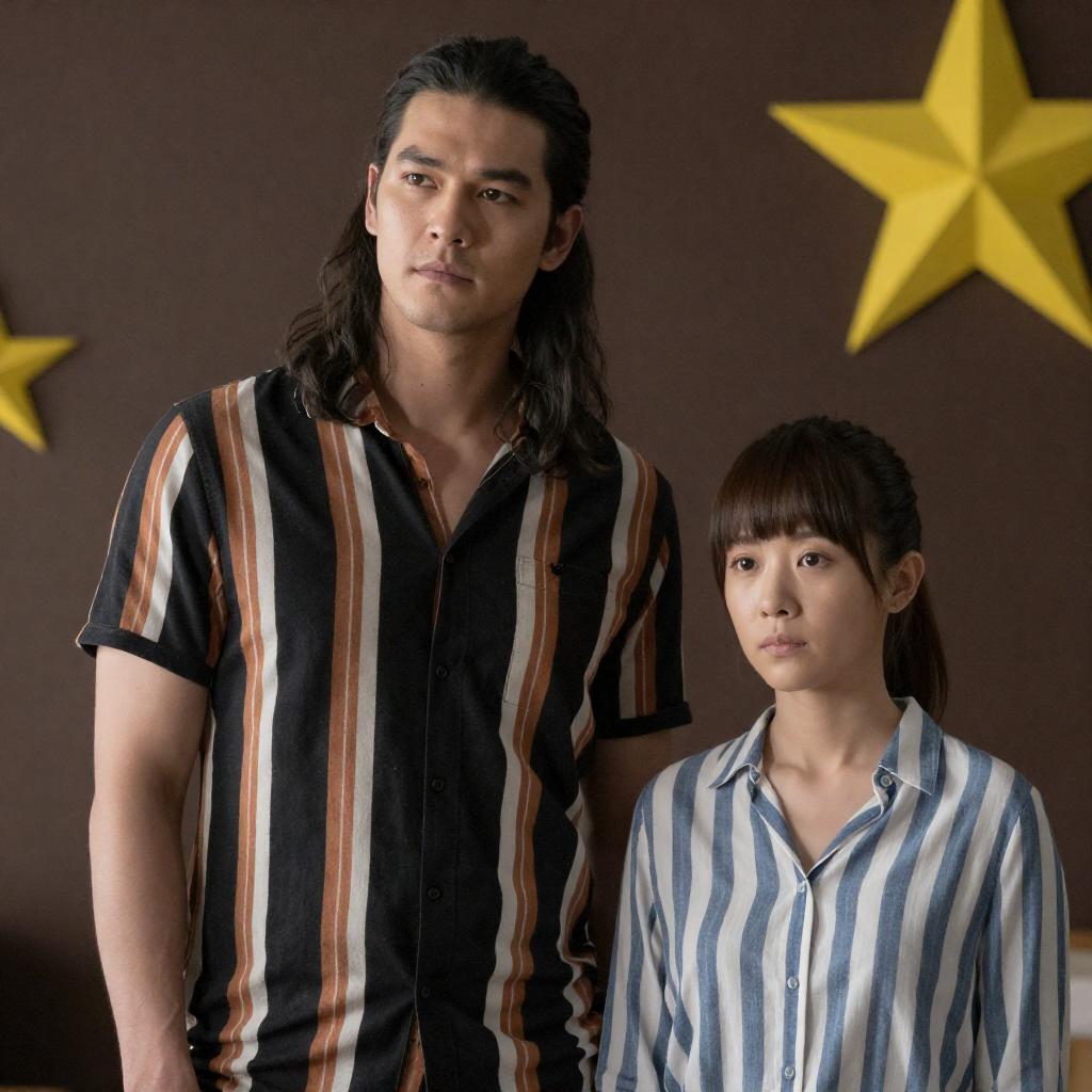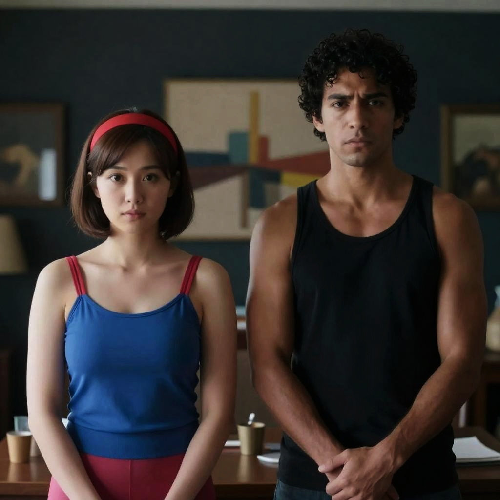 Photograph of two people standing in a dimly lit room. Woman on left has short brown hair, red headband, blue top with red straps, and light skin. Man on right has dark curly hair, muscular build, tan skin, black tank top, and serious expression. Both hands clasped in front. Background has dark walls with abstract paintings and scattered objects. Woman holding a pink object in front.