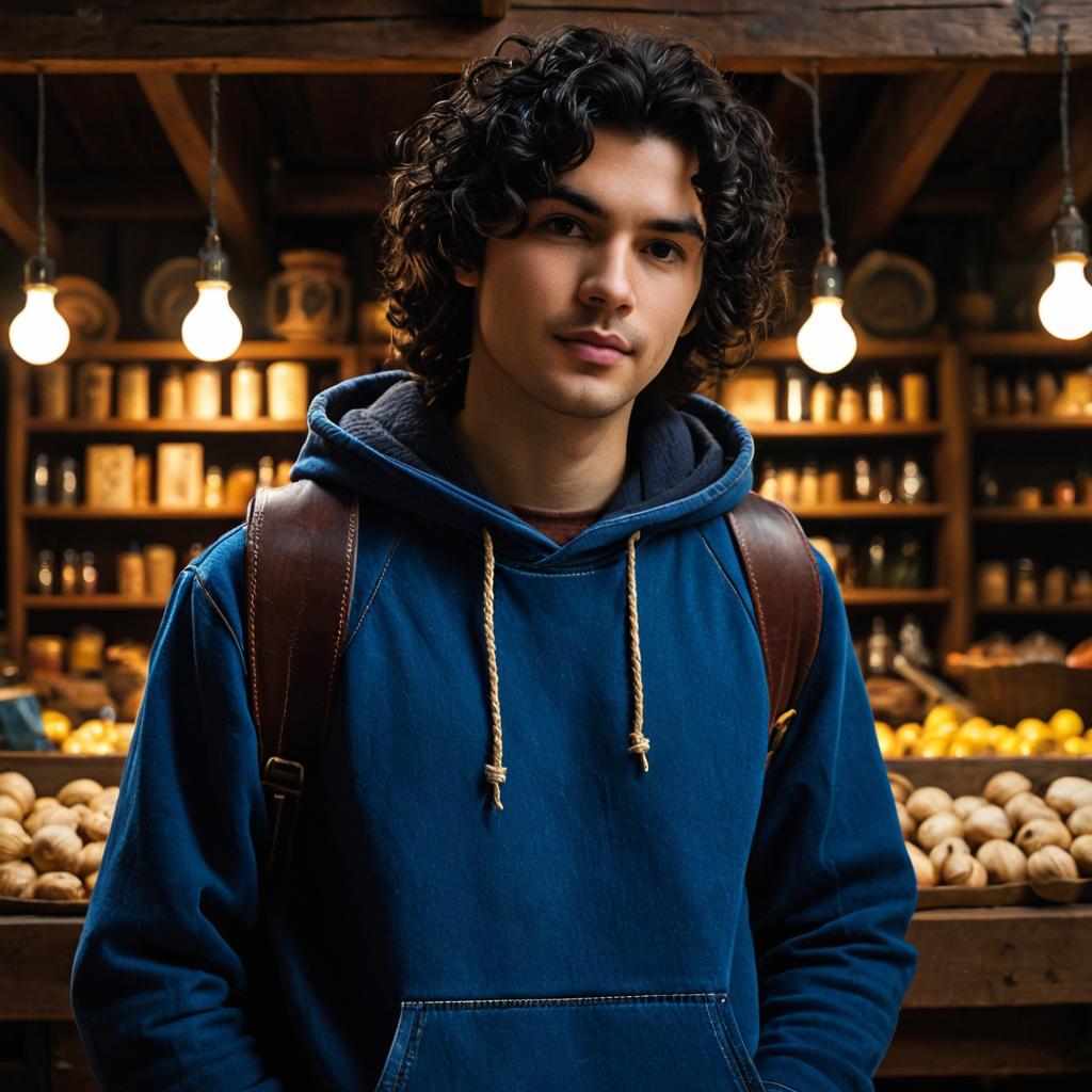 Coraline star outfit, photorealistic CGI, young man, dark curly hair, brown eyes, wearing worn blue hoodie with brown straps, dark brown shirt, blue jeans with belt, standing in dimly lit market stall, warm glowing lights in background, medieval fantasy setting, wooden shelves with miscellaneous items, detailed ures on clothing and background, slightly disheveled appearance, neutral expression, realistic lighting, atmospheric, moody ambiance, realistic skin tones