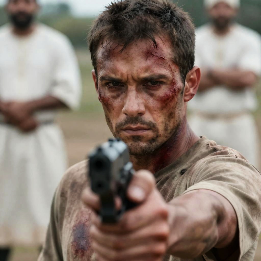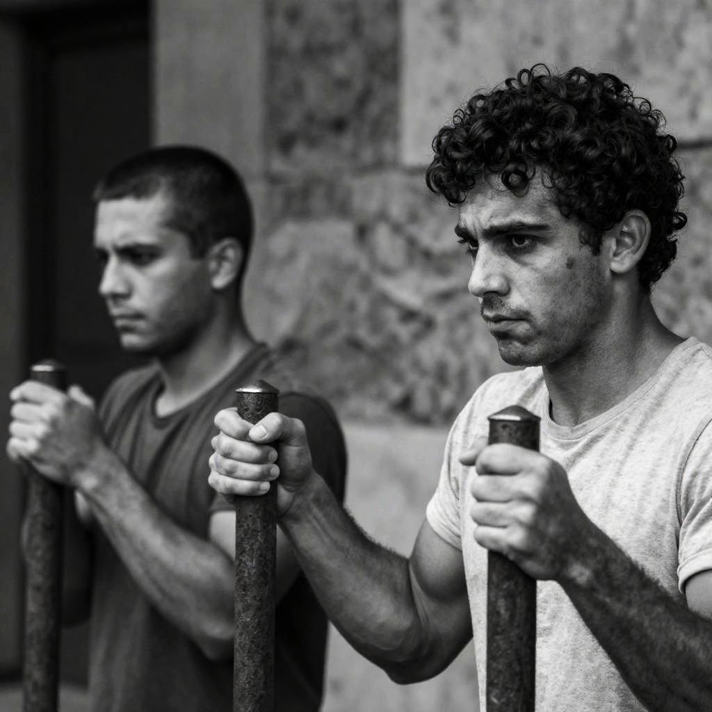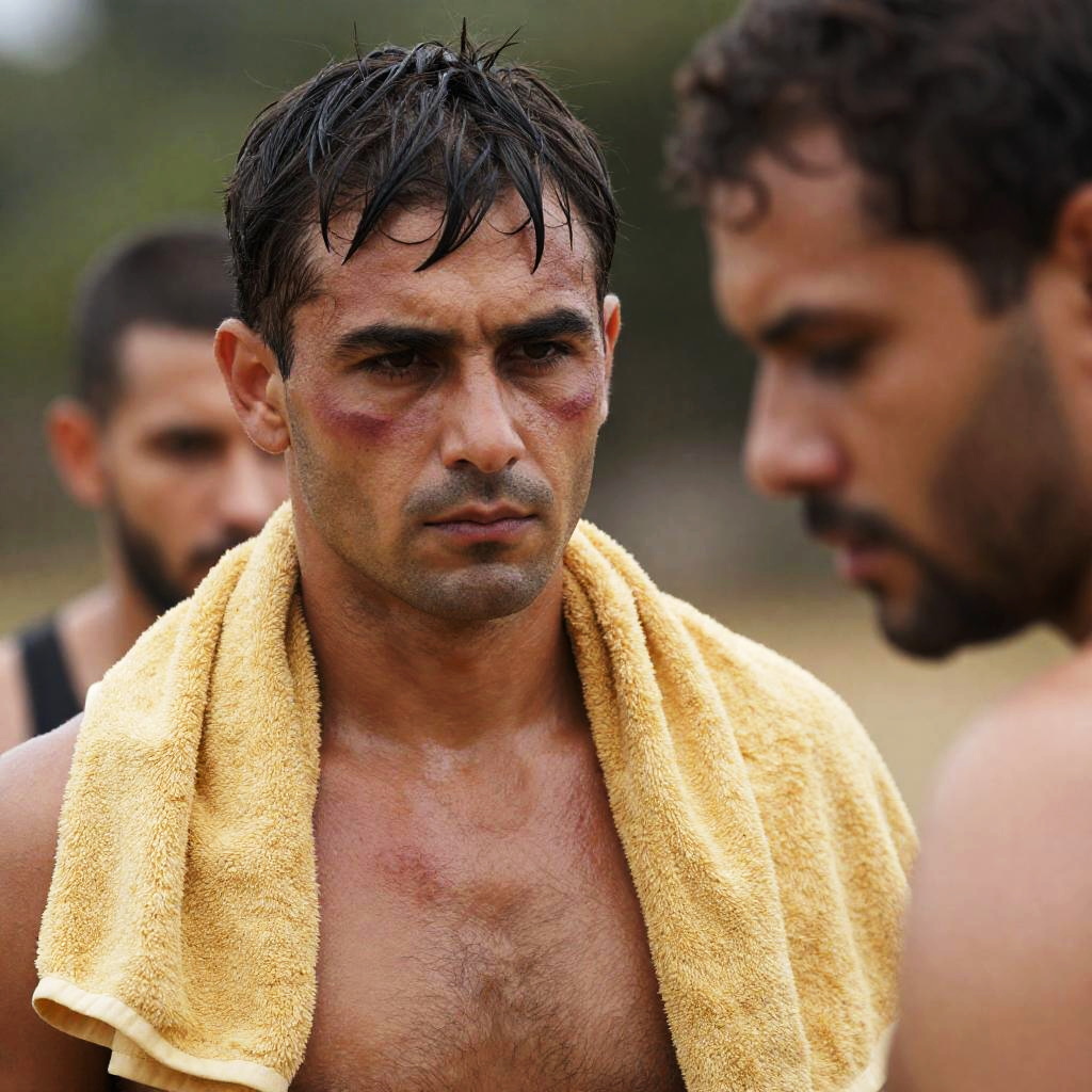 Photograph of a middle-aged man with wet, dark hair, wearing a yellow towel around his shoulders, exposing a sweaty, hairy chest with a bruise on his left cheek. He has a serious, focused expression. A second man with curly hair, slightly blurred, is on the right, looking downward with a concerned expression. Background is blurred, with indistinct figures and muted colors. Two people.