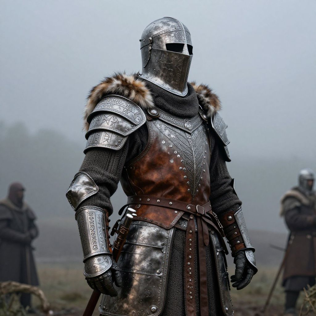 Shield maiden armor, intricately designed Nordic warrior gear with leather and metal plates, fur accents, intricate rune engravings, battle-worn yet elegant, standing proud on a misty battlefield, dramatic lighting highlighting the powerful silhouette.